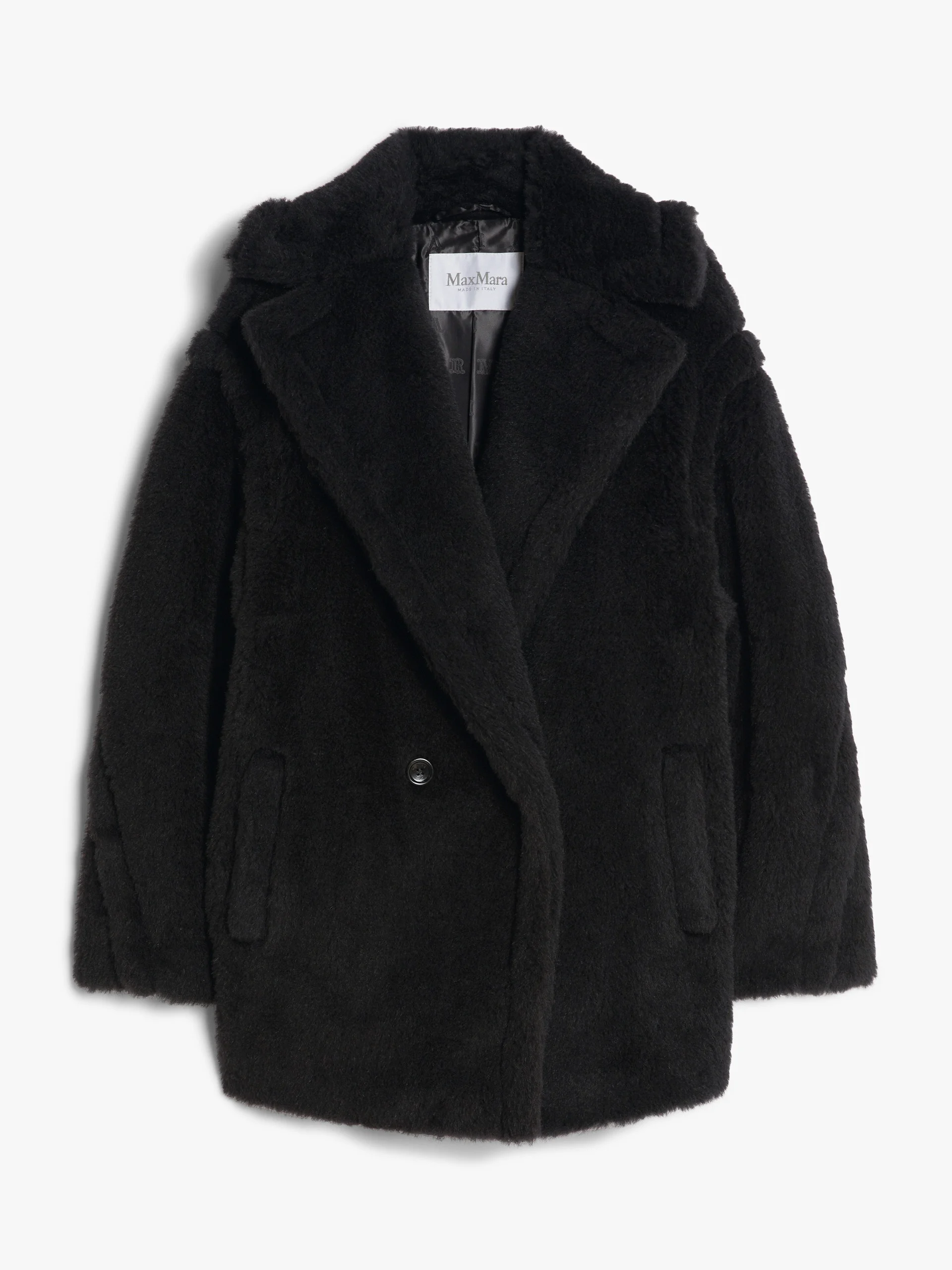 DETAILS Iconic Teddy coat in alpaca and wool on a silk base, available in a new short, above-the-knee length version. The classic style’s oversized fit and details are repeated: large lapel collar, low-set sleeves and vertical welt pockets. Double-breasted style lined in Monogram jacquard fabric. Visible button fastening. COMPOSITION AND CARE Jersey fabric 62% alpaca, 26% virgin wool, 12% silk; lining 100% viscose. Do not wash; do not bleach; do not tumble dry; do not iron; professionally dry clean perchloroethylene - mild process; do not wet clean.; protect buttons before washing.; contains non-textile parts of animal origin. Distributed by Max Mara S.r.l., registered office in Reggio Emilia (Italy), Via Giulia Maramotti 4, 42124 (IT)