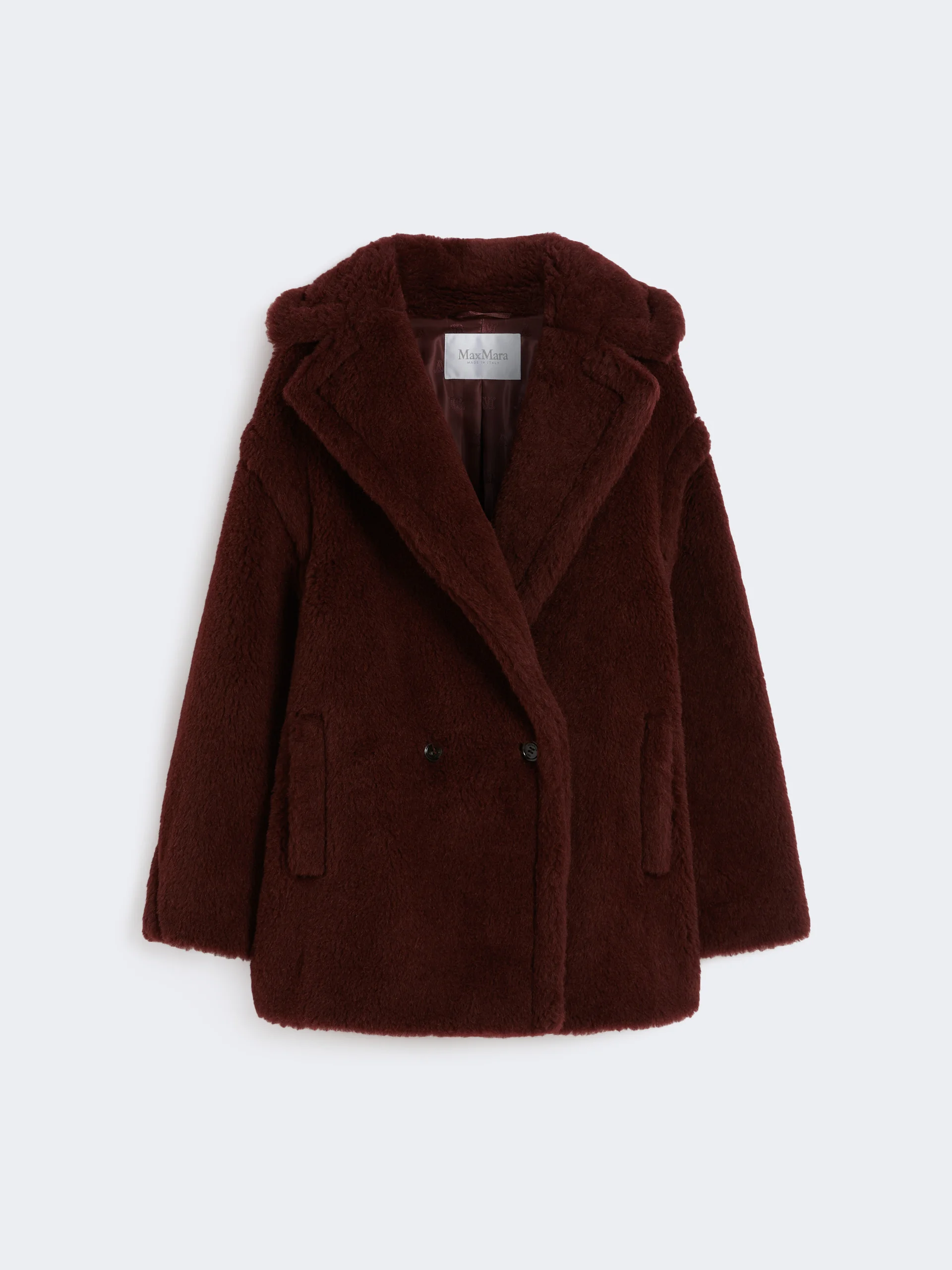 DETAILS Iconic Teddy Bear coat in a short mid-thigh version. Coat made of alpaca and wool Teddy fabric on a silk base Oversized volume Wide lapel collar Long sleeves with dropped shoulders Double-breasted closure with two visible buttons Welt pockets on the sides Lined COMPOSITION AND CARE Jersey fabric 62% alpaca, 26% virgin wool, 12% silk; lining 100% viscose. Do not wash; do not bleach; do not tumble dry; do not iron; professionally dry clean perchloroethylene - mild process; do not wet clean.; protect buttons before washing.; contains non-textile parts of animal origin. Distributed by Max Mara S.r.l., registered office in Reggio Emilia (Italy), Via Giulia Maramotti 4, 42124 (IT)