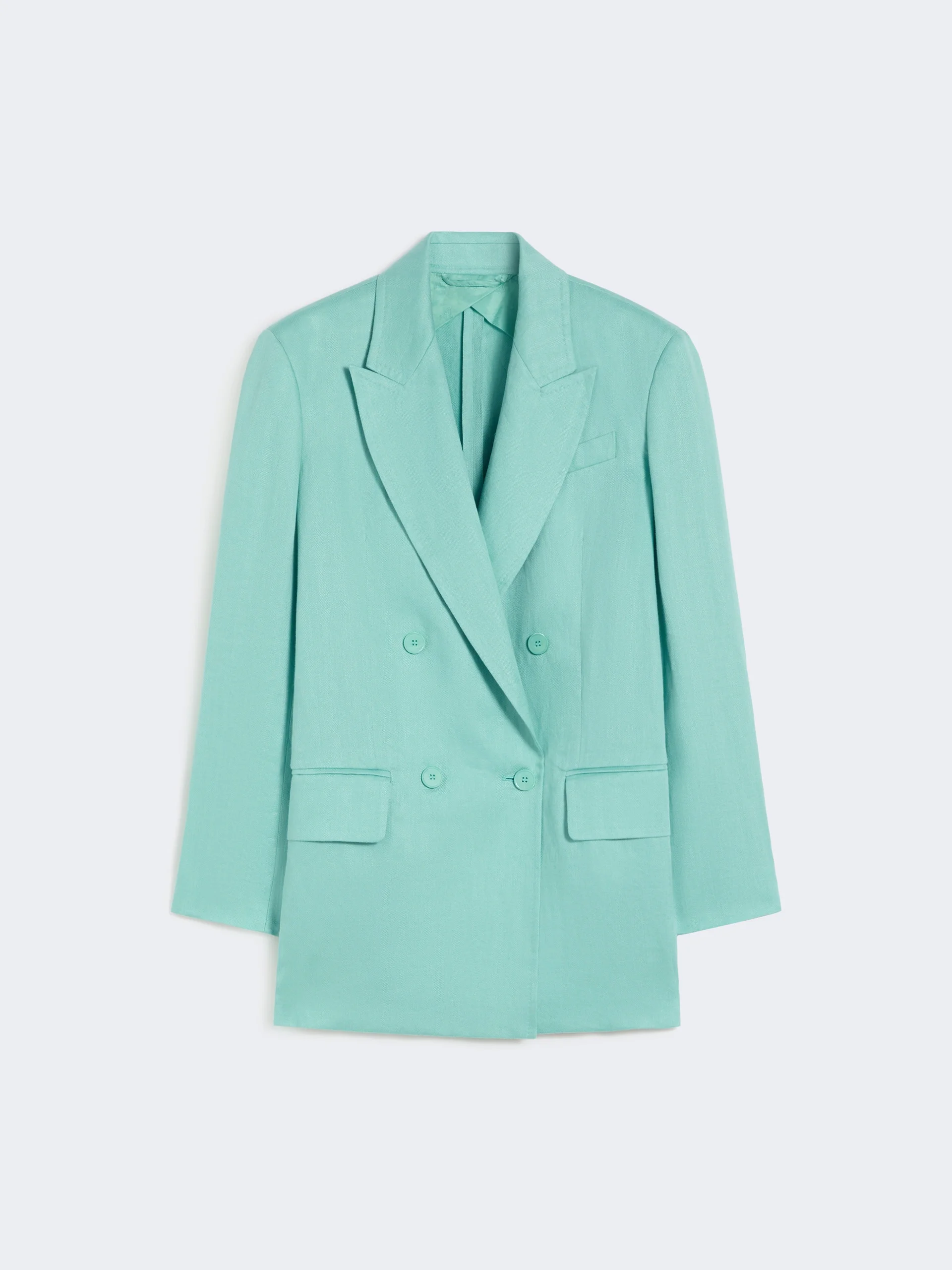 DETAILS Figure-skimming double-breasted blazer featuring a herringbone pattern. - Mottled pure linen twill blazer - Straight fit with slightly wide shoulders - Peak-lapel collar and set-in sleeves with buttoned hem detail - Front button fastening - Breast pocket and flap welt pockets on the front - Embellished with tailoring-style hand-stitched detail and a double side slit at the back - Half-lined model COMPOSITION AND CARE Fabric 100% flaxlinen; lining 57% cupro, 43% cotton. Do not wash; do not bleach; do not tumble dry; cool iron; professionally dry clean perchloroethylene - mild process; do not wet clean.; wash the garment while it is fastened.; do not iron the buttons.; protect buttons before washing.; contains non-textile parts of animal origin. Distributed by Max Mara S.r.l., registered office in Reggio Emilia (Italy), Via Giulia Maramotti 4, 42124 (IT) Collection: Max Mara Product code: 1041036206001 - MXMOLIMPIA1