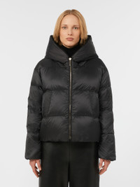 DETAILS Short padded, reversible jacket with hood and slightly cropped cut. Jacket in alpaca and wool fabric with a faux fur effect Interior in water-repellent quilted canvas Regular fit Long sleeves with dropped shoulders Front zip closure Welt pockets on both sides and internal patch pockets Goose-down padding COMPOSITION AND CARE Fabric 62% alpaca, 38% virgin wool; inner fabric 100% polyester; with quilting virgin goose-down. Do not wash; do not bleach; do not tumble dry; cool iron; professionally dry clean perchloroethylene - mild process; do not wet clean.; wash the garment while it is fastened.; don’t iron the labels.; contains non-textile parts of animal origin. Distributed by Max Mara S.r.l., registered office in Reggio Emilia (Italy), Via Giulia Maramotti 4, 42124 (IT)