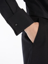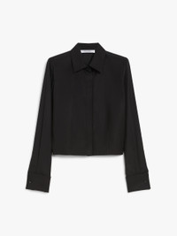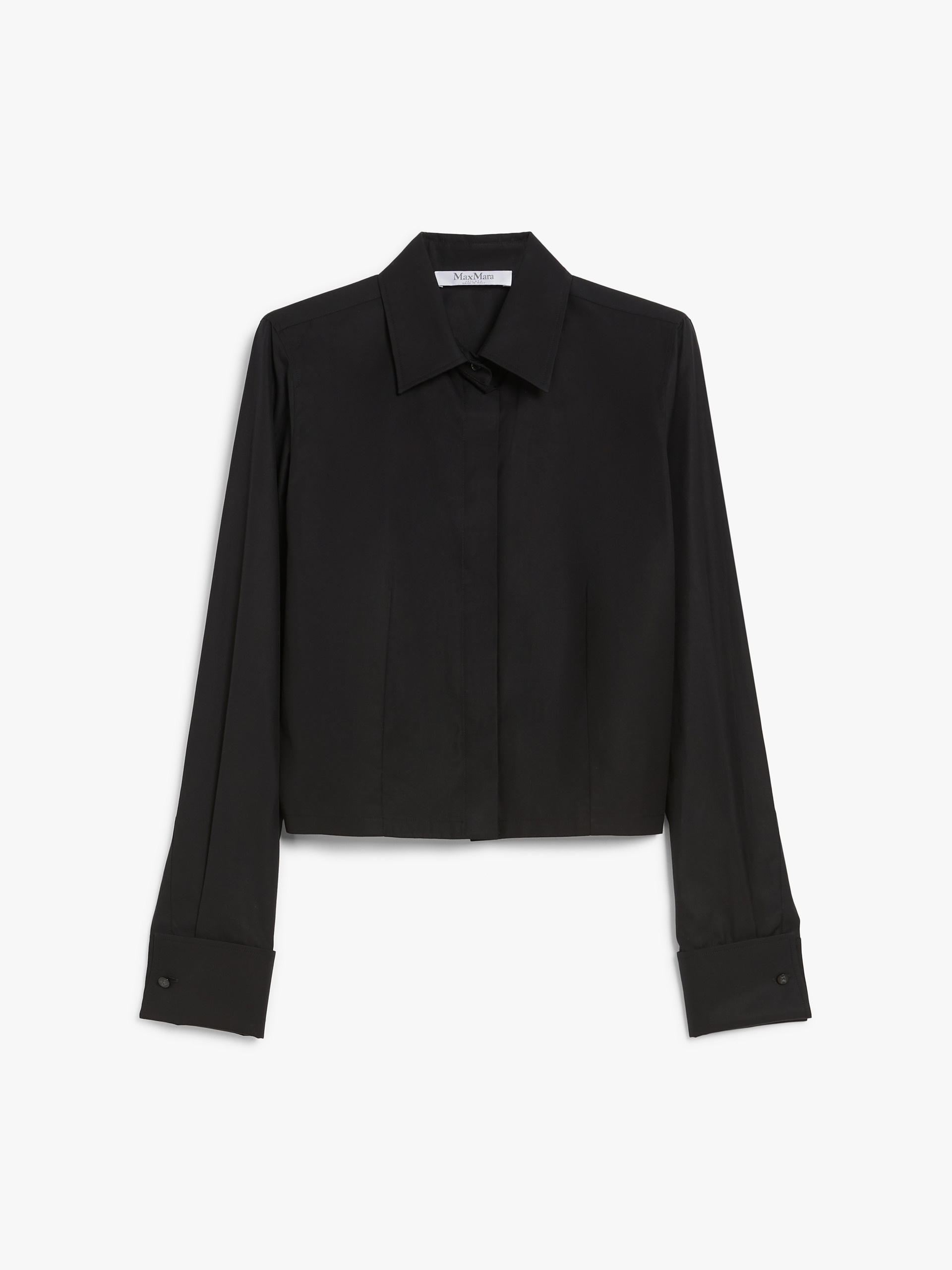 DETAILS Cropped shirt in pure cotton poplin, featuring a rounded slash that reveals the back. The garment features a classic pointed collar, long sleeves with high cuffs and customised cufflink buttons. Concealed button fastening at the front. COMPOSITION AND CARE 100% cotton. Machine wash cold delicate cycle; do not bleach; do not tumble dry; line drying in the shade; cool iron; professionally dry clean perchloroethylene - mild process.; wash the garment while it is fastened.; turn the articles inside out before washing.; remove the cufflinks before washing.; contains non-textile parts of animal origin. Distributed by Max Mara S.r.l., registered office in Reggio Emilia (Italy), Via Giulia Maramotti 4, 42124 (IT)