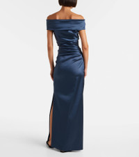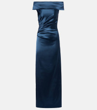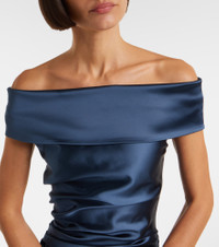 Boasting a rich manufacturing history, Max Mara represents the quintessence of Italian sophistication and expertise. The Opaco gown is crafted from lustrous satin with an off-shoulder neckline, sculpting gathering, and comfortable side slit. Product Details - Material: 74% acetate, 23% polyamide, 3% elastane - Care instructions: dry clean - Made in Italy - Designer color name: Grafite - Item color: blue - Lining: 74% acetate, 23% polyamide, 3% elastane - Closure: zipped side - Long vent - Item number: P01096041 Size & Fit - True to size - For larger bust sizes we recommend taking one size up - Off-the-shoulder - Fitted - Slightly stretchy fabric - The model seen in the picture is 178cm-5'10" and wearing a size DE 34