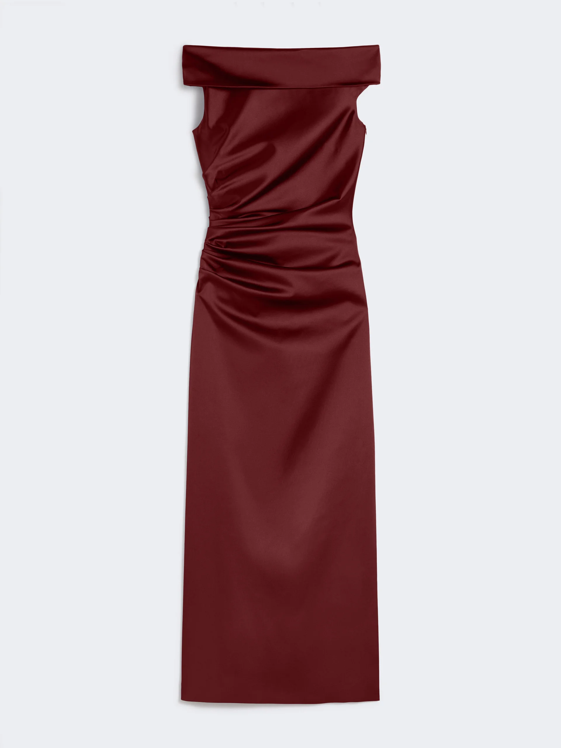 DETAILS Long dress featuring a draped bustier on the right side of the waist and a low neckline. Stretch satin dress Fitted, feminine line Concealed zip fastening at the side Deep slit on the left side Unlined COMPOSITION AND CARE Fabric 74% acetate, 23% polyamide, 3% elastane; lining 74% acetate, 23% polyamide, 3% elastane. Do not wash; do not bleach; do not tumble dry; cool iron; professionally dry clean perchloroethylene - mild process; do not wet clean. Distributed by Max Mara S.r.l., registered office in Reggio Emilia (Italy), Via Giulia Maramotti 4, 42124 (IT)