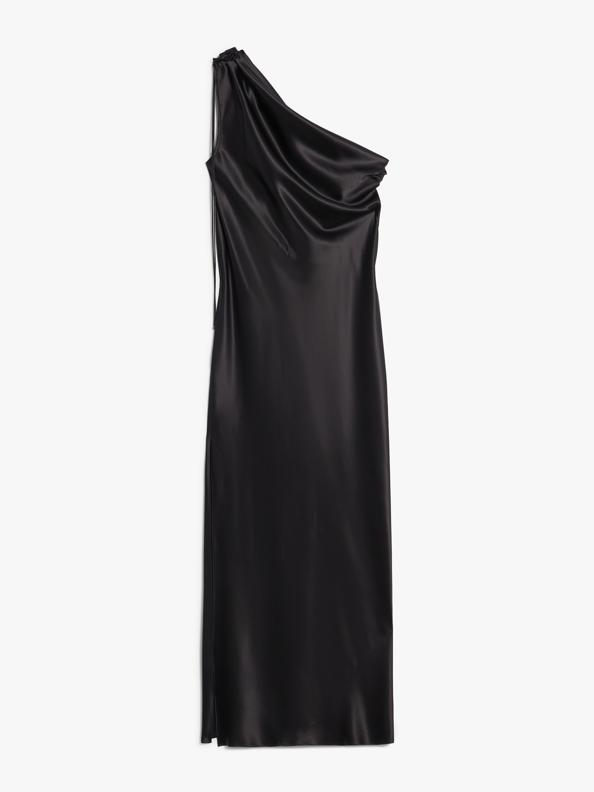 DETAILS Elegant long one-shoulder dress, made of luxurious heavy pure silk satin. The ruffle on the shoulder strap, with a faux drawstring detail with a thin tie with metal tips, creates a soft draped motif at the bottom which highlights the silhouette and skims the hips. Unlined style, finished with a deep side slit. COMPOSITION AND CARE 100% silk. Do not wash; do not bleach; do not tumble dry; cool iron; professionally dry clean perchloroethylene - mild process; do not wet clean.; iron with a cloth between. Distributed by Max Mara S.r.l., registered office in Reggio Emilia (Italy), Via Giulia Maramotti 4, 42124 (IT)
