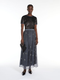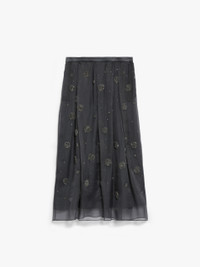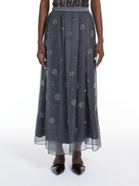 DETAILS Long circle skirt in lightweight organza fabric. This piece is embellished with rhinestone and micro sequin embroidery all over. COMPOSITION AND CARE Fabric 100% silk; embroidery thread 100% polyester; - exclusive of decoration; lining 100% cotton. Do not wash; do not bleach; do not tumble dry; cool iron; professionally dry clean perchloroethylene - mild process; do not wet clean.; put this item into a string bag before washing it.; turn the articles inside out before washing. Distributed by Max Mara S.r.l., registered office in Reggio Emilia (Italy), Via Giulia Maramotti 4, 42124 (IT)