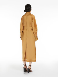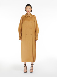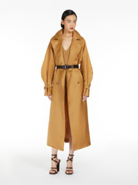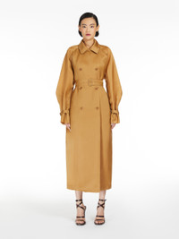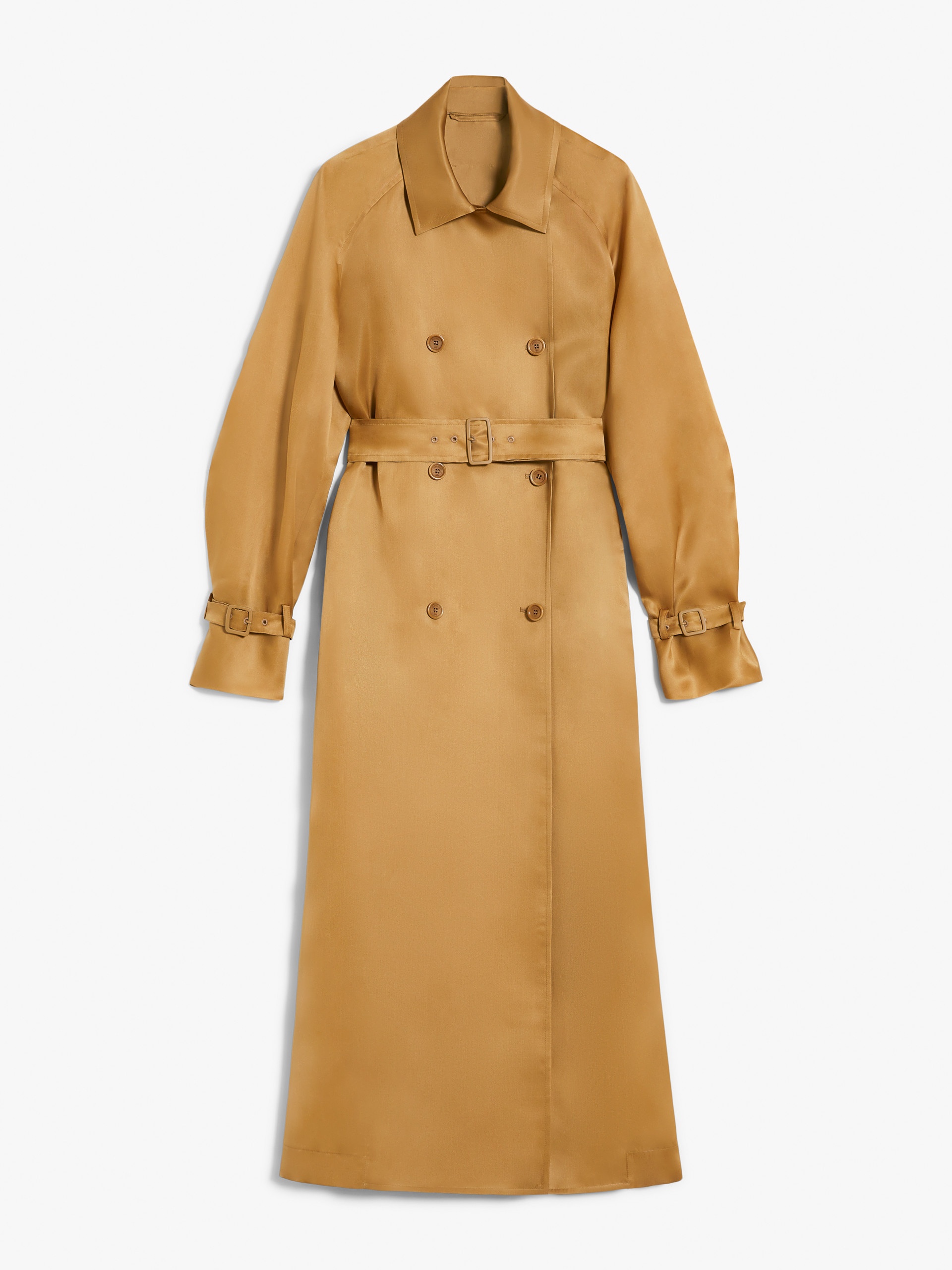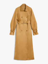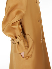 DETAILS Long double-breasted trench coat made of luxurious pure silk triple organza with a satin look. Unlined style with an oversized fit, long raglan sleeves that are loose around the elbow, cuff straps, buttoned flap pockets on the sides and centre-back slit. The matching belt with buckle accentuates the feminine silhouette. Finished with a reverse pleat on the back and fastened with matching buttons. COMPOSITION AND CARE 100% silk. Do not wash; do not bleach; do not tumble dry; cool iron; professionally dry clean perchloroethylene - mild process; do not wet clean.; do not iron the buttons.; protect the buckle before washing.; turn the articles inside out before washing. Distributed by Max Mara S.r.l., registered office in Reggio Emilia (Italy), Via Giulia Maramotti 4, 42124 (IT)