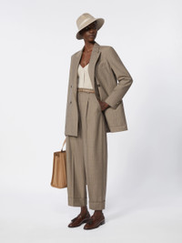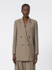DETAILS Double-breasted blazer with an elongated silhouette and oversized volume. - Blazer in yarn-dyed pinstripe pure woollen cloth - Peak-lapel collar and a breast pocket - Set-in sleeves with buttoned hem detail - Front button fastening - Double vent on the back - Semi-lined in jacquard fabric COMPOSITION AND CARE Fabric 100% virgin wool; lining 100% viscose. Do not wash; do not bleach; do not tumble dry; cool iron; professionally dry clean perchloroethylene - mild process; do not wet clean.; do not iron the buttons.; protect buttons before washing.; contains non-textile parts of animal origin. Distributed by Max Mara S.r.l., registered office in Reggio Emilia (Italy), Via Giulia Maramotti 4, 42124 (IT) Collection: Max Mara Product code: 1041066106001 - MXMACCIAIO
