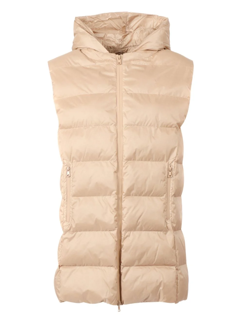padded hooded gilet Highlights - Beige - Padded design - Classic hood - Front zip fastening - Sleeveless - Side zip pockets Imported Composition Outer: Polyamide 100% Lining: Polyamide 100%, Polyester 70%, Camel Leather 27%, Silk 3% Washing instructions Read Manufacturer Guidelines
