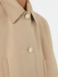DETAILS Single-breasted cropped cape with shirt details and small central slit on the back. Water-repellent pure cotton cape - Flared - Classic shirt collar with stitching under the collar - Front fastening with metal buttons - Small front slits enabling you to put your hands in your pockets - Welt pockets on the sides COMPOSITION AND CARE 100% cotton. Do not wash; do not bleach; do not tumble dry; cool iron; professionally dry clean perchloroethylene - mild process; do not wet clean.; wash the garment while it is fastened. Distributed by Max Mara S.r.l., registered office in Reggio Emilia (Italy), Via Giulia Maramotti 4, 42124 (IT)