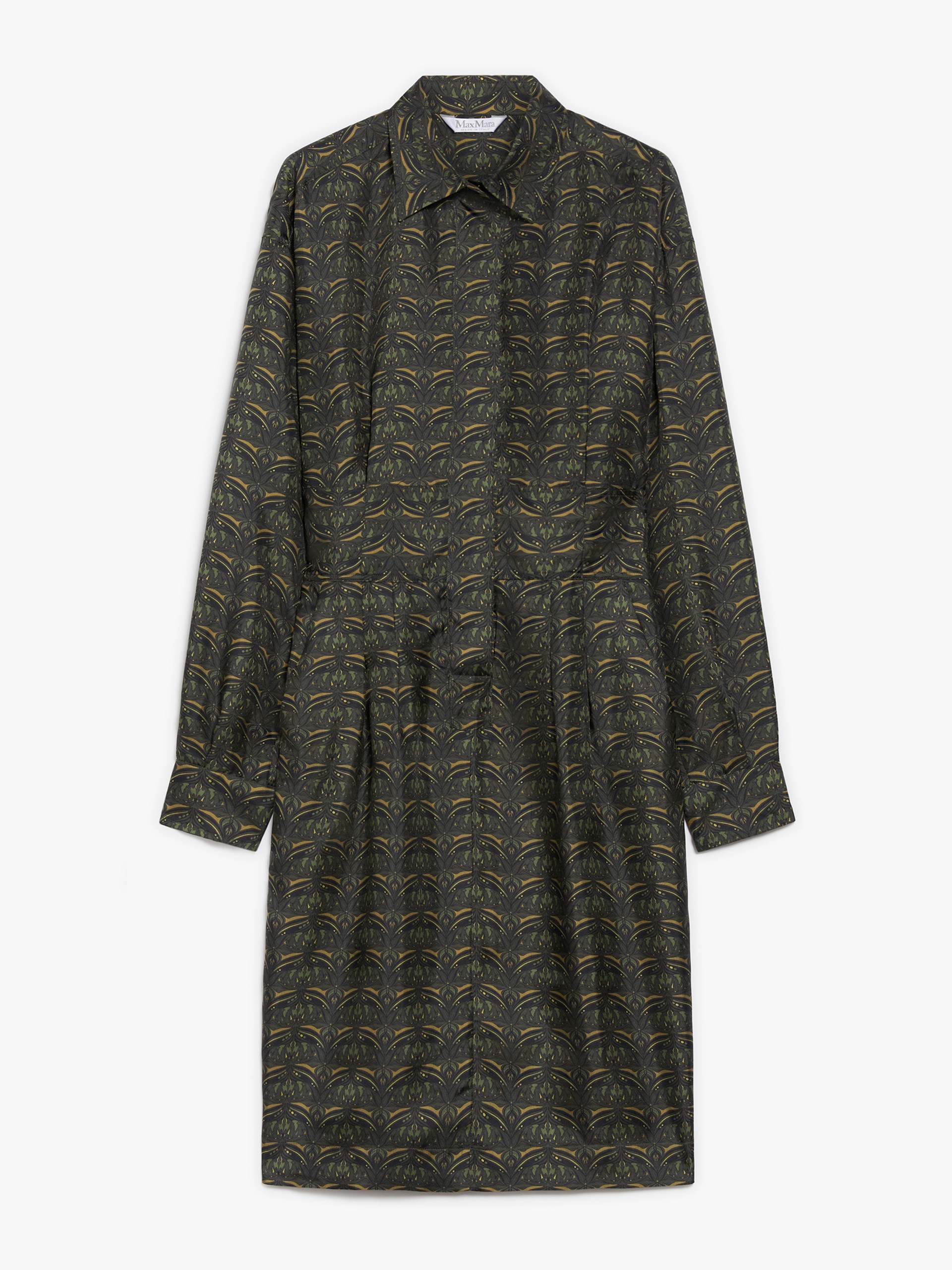 DETAILS Short shirt dress in exquisite printed pure silk twill with a straight silhouette, high belt sewn at the waist and pleats on the front. This unlined design features long sleeves, buttoned shirt cuffs, inset side pockets, and a central vent at the back. Concealed button fastening at the front. COMPOSITION AND CARE 100% silk. Do not wash; do not bleach; do not tumble dry; cool iron; professionally dry clean perchloroethylene - mild process; do not wet clean.; wash the garment while it is fastened.; do not iron the buttons.; protect buttons before washing.; turn the articles inside out before washing. Distributed by Max Mara S.r.l., registered office in Reggio Emilia (Italy), Via Giulia Maramotti 4, 42124 (IT)