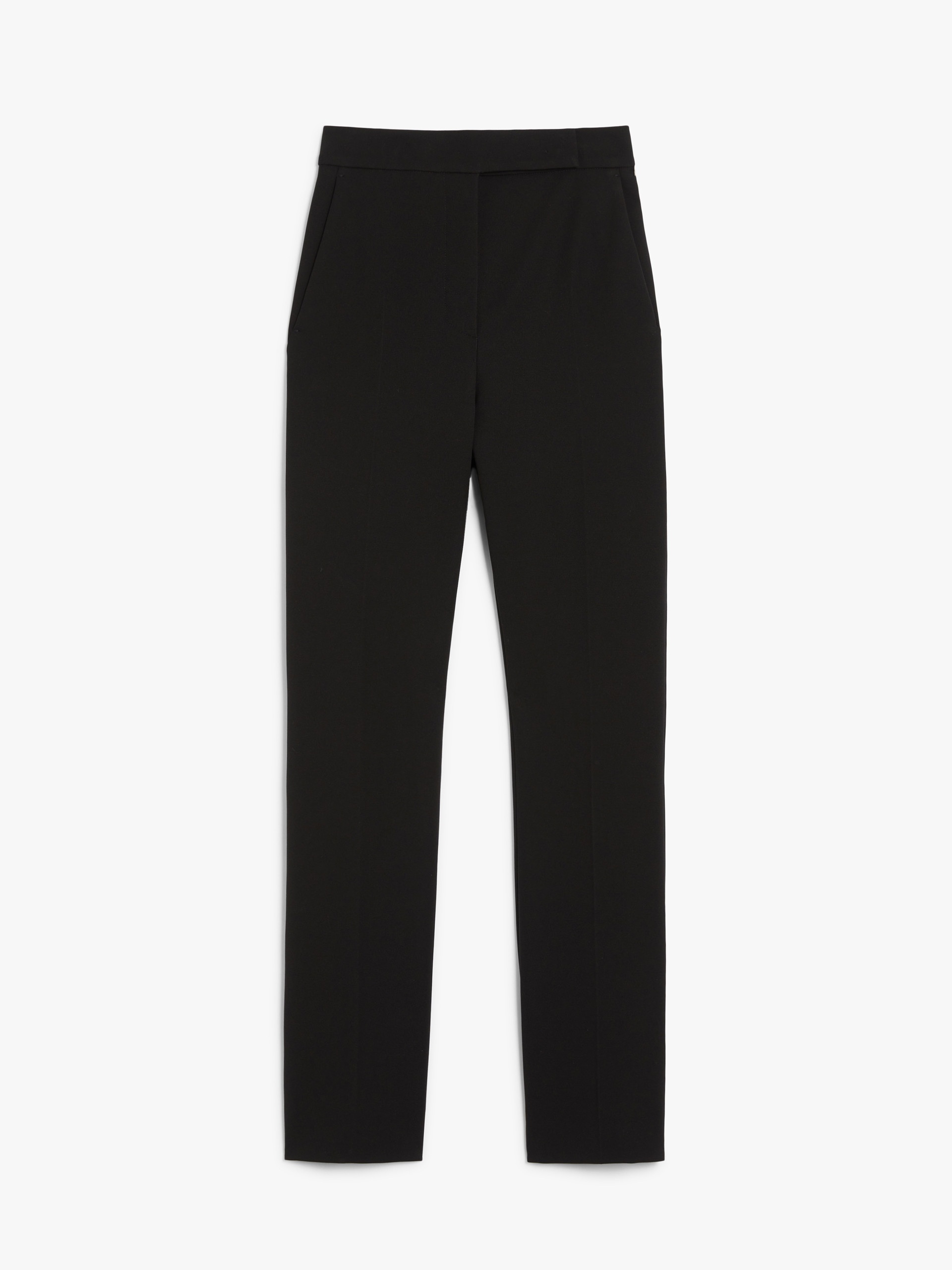 DETAILS Straight-cut trousers made of compact stretch viscose jersey. Slim-fit garment, cropped to the ankle, with a trouser crease, side slant pockets and buttoned welt pockets at the back. Fastened with a wide waistband tab, zip fly and small hook. COMPOSITION AND CARE 78% viscose, 16% polyamide, 6% elastane. Do not wash; do not bleach; do not tumble dry; cool iron; professionally dry clean perchloroethylene - mild process; do not wet clean.; do not iron the buttons.; protect buttons before washing.; contains non-textile parts of animal origin. Distributed by Max Mara S.r.l., registered office in Reggio Emilia (Italy), Via Giulia Maramotti 4, 42124 (IT)