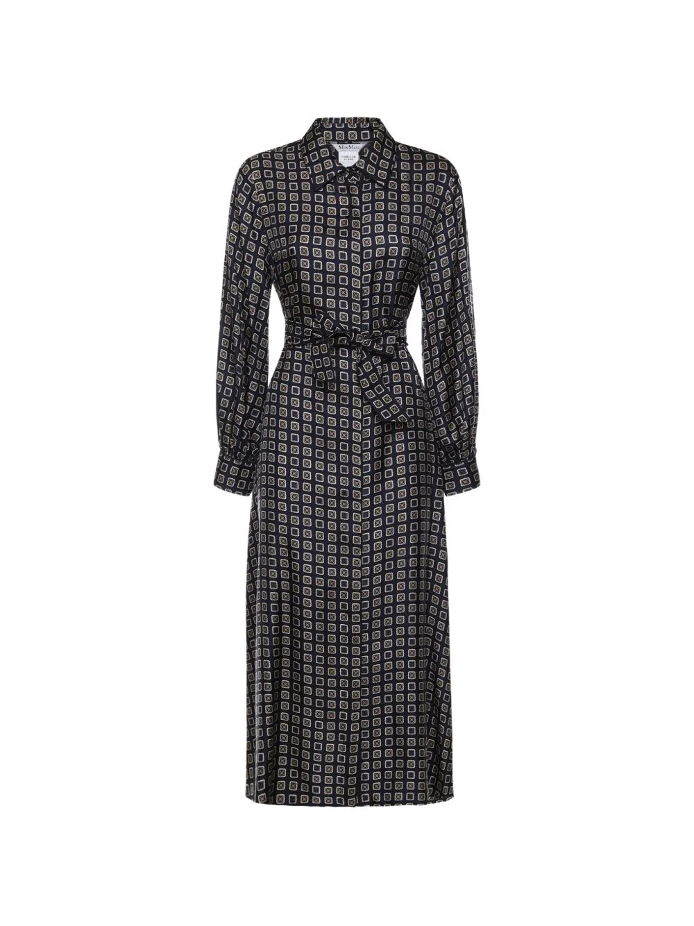 patterned tie-waist midi dress Highlights - Blue - Geometric pattern - Tie belt - Shirt style - Long sleeves - Button fastening Made in Italy Composition Silk 100% Washing instructions Read Manufacturer Guidelines