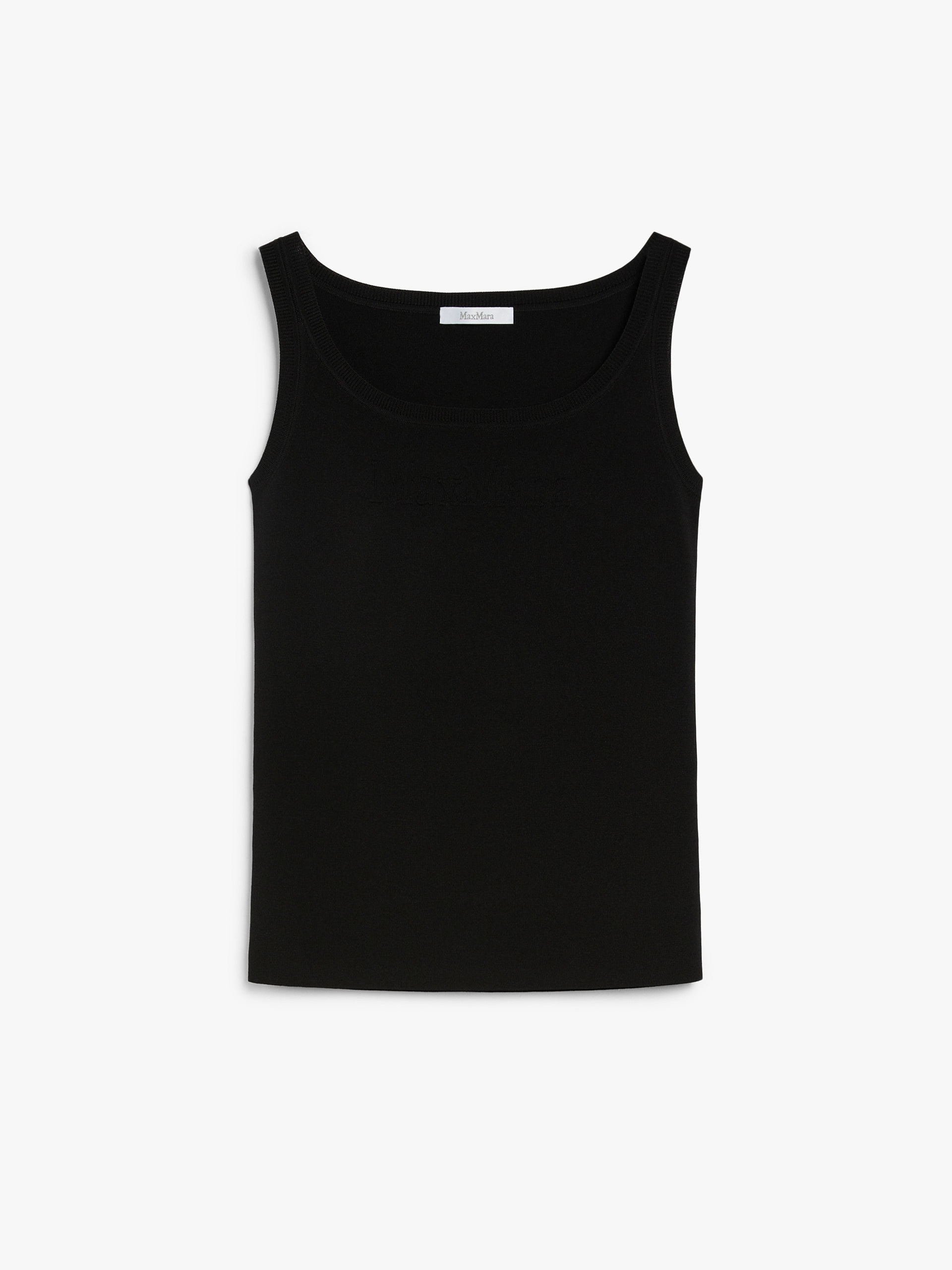 DETAILS Sleeveless bodycon top made of viscose crepe yarn. The garment features a generous round neckline, small shoulder straps and a printed, embossed logo printed on the front. Finished with ribbed edges. COMPOSITION AND CARE 65% viscose, 35% polyamide. Hand wash cold; do not bleach; do not tumble dry; flat drying in the shade; cool iron; professionally dry clean perchloroethylene - mild process; do not wet clean.; iron with a cloth between.; using neutral detergent. Distributed by Max Mara S.r.l., registered office in Reggio Emilia (Italy), Via Giulia Maramotti 4, 42124 (IT)