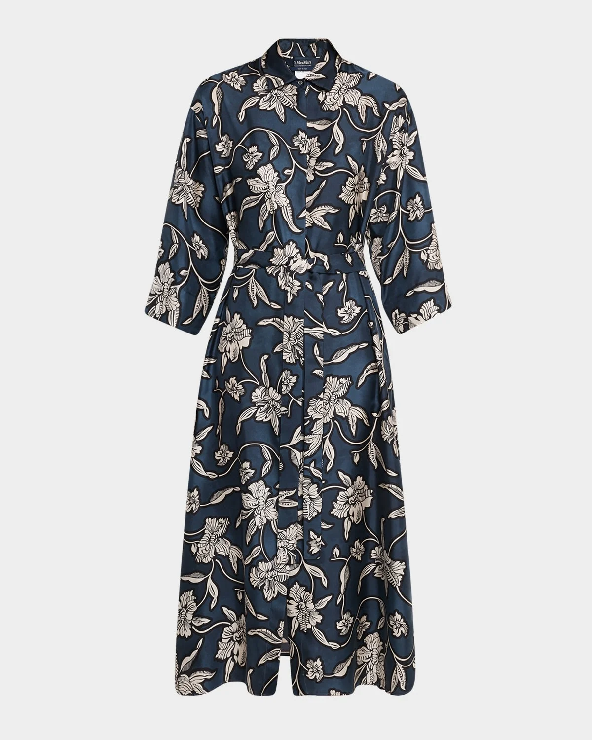 - Max Mara "Peonia" shirtdress featuring a floral print and a waist sash - Point collar; concealed button front - Long sleeves - Self-tie belted waist - Side split pockets - Hem falls below the knee - A-line silhouette - Side slits hem - Silk - Dry clean - Made in Romania