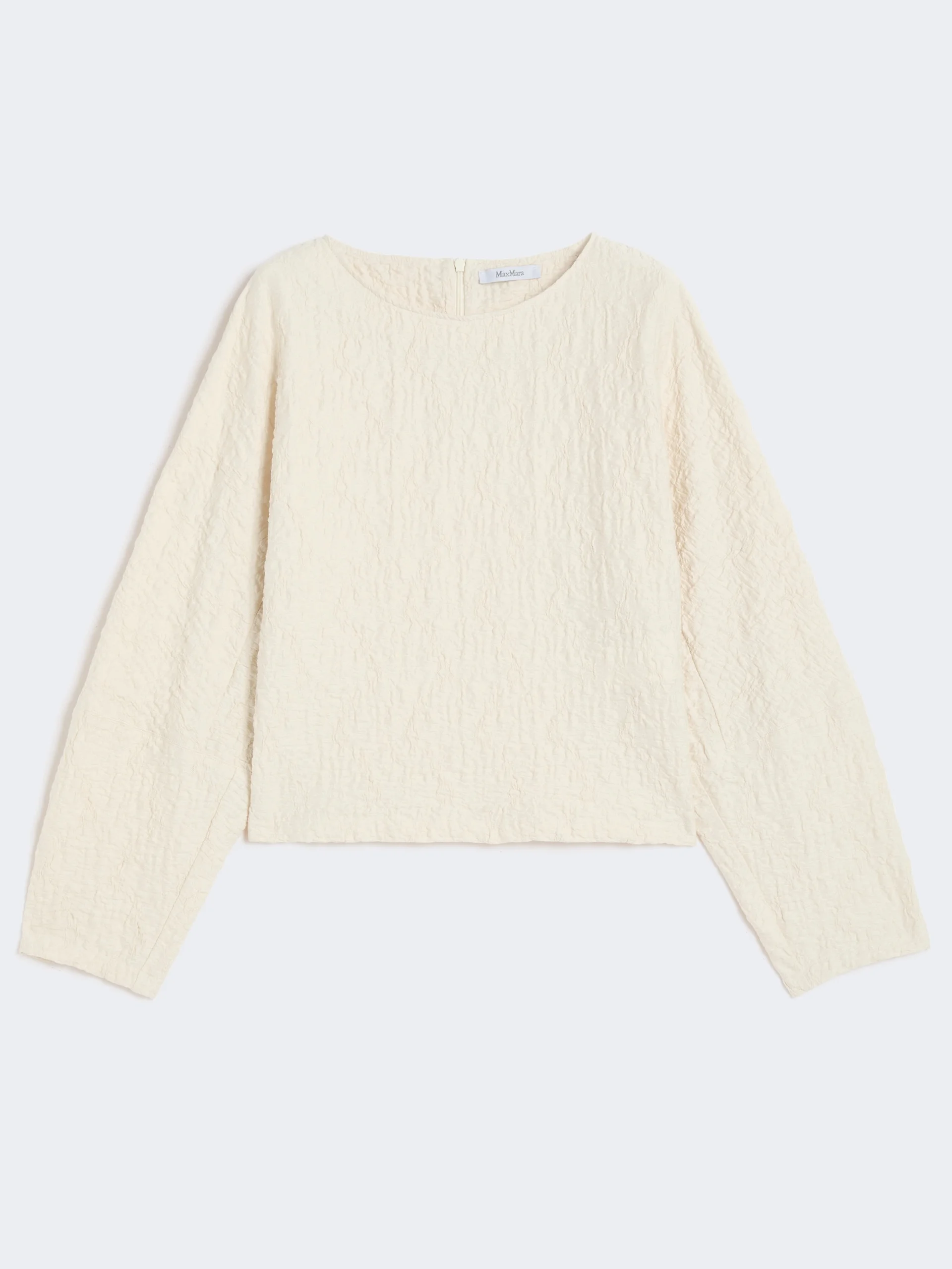 DETAILS Short blouse, featuring a slightly flared boxy silhouette. Blouse in a wavy effect jersey Crew neck Long kimono sleeves Back zip fastening COMPOSITION AND CARE 80% cotton, 18% polyamide, 2% elastane. Machine wash cold delicate cycle; do not bleach; do not tumble dry; flat drying in the shade; cool iron; professionally dry clean perchloroethylene - mild process; professional wet cleaning - very mild process.; iron with a cloth between.; just steam it.; using neutral detergent. Distributed by Max Mara S.r.l., registered office in Reggio Emilia (Italy), Via Giulia Maramotti 4, 42124 (IT)