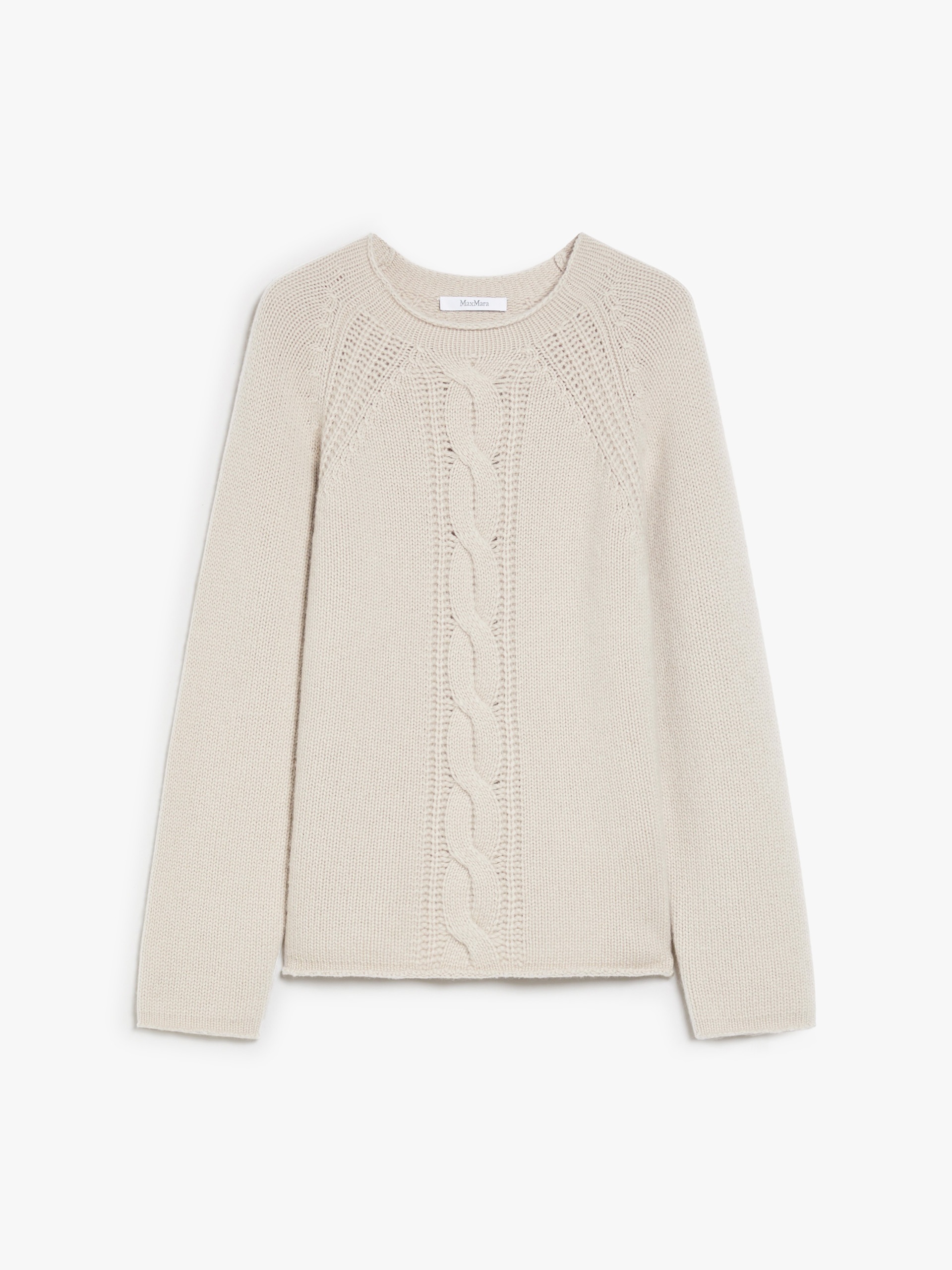 DETAILS Fine pure cashmere yarn sweater featuring a stockinette stitch with a central braid detail on the front. Soft volume design featuring a gently draped neckline, long raglan sleeves, and unfinished edges. COMPOSITION AND CARE 100% cashmere. Hand wash cold; do not bleach; do not tumble dry; flat drying in the shade; cool iron; professionally dry clean perchloroethylene - mild process; do not wet clean.; iron with a cloth between.; using neutral detergent. Distributed by Max Mara S.r.l., registered office in Reggio Emilia (Italy), Via Giulia Maramotti 4, 42124 (IT)