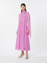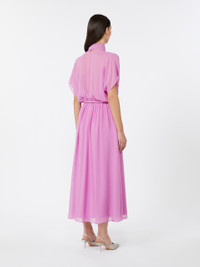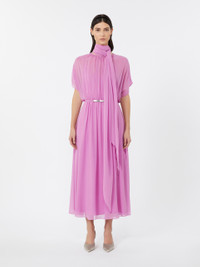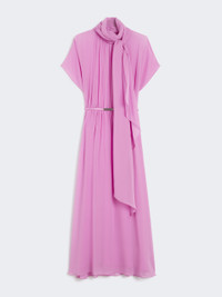 DETAILS Long dress with removable sash that ties in a bow at the neck. Washed, pure silk georgette dress Flared Crew neckline Cap sleeves Zip fastening and deep teardrop opening on the back Matching belt in patent leather with brushed metal buckle Matching sewn-in slip COMPOSITION AND CARE Dress fabric 100% silk; lining 100% viscose; with belt in polyester with polyurethane coating. Dress: hand wash cold (40°c max); do not bleach; do not tumble dry; line drying in the shade; cool iron; professionally dry clean perchloroethylene - mild process; do not wet clean.; Wash the garment while it is fastened.; Contains non-textile parts of animal origin. Belt: do not wash; do not bleach; do not tumble dry; do not iron; do not dry clean; do not wet clean. Distributed by Max Mara S.r.l., registered office in Reggio Emilia (Italy), Via Giulia Maramotti 4, 42124 (IT)