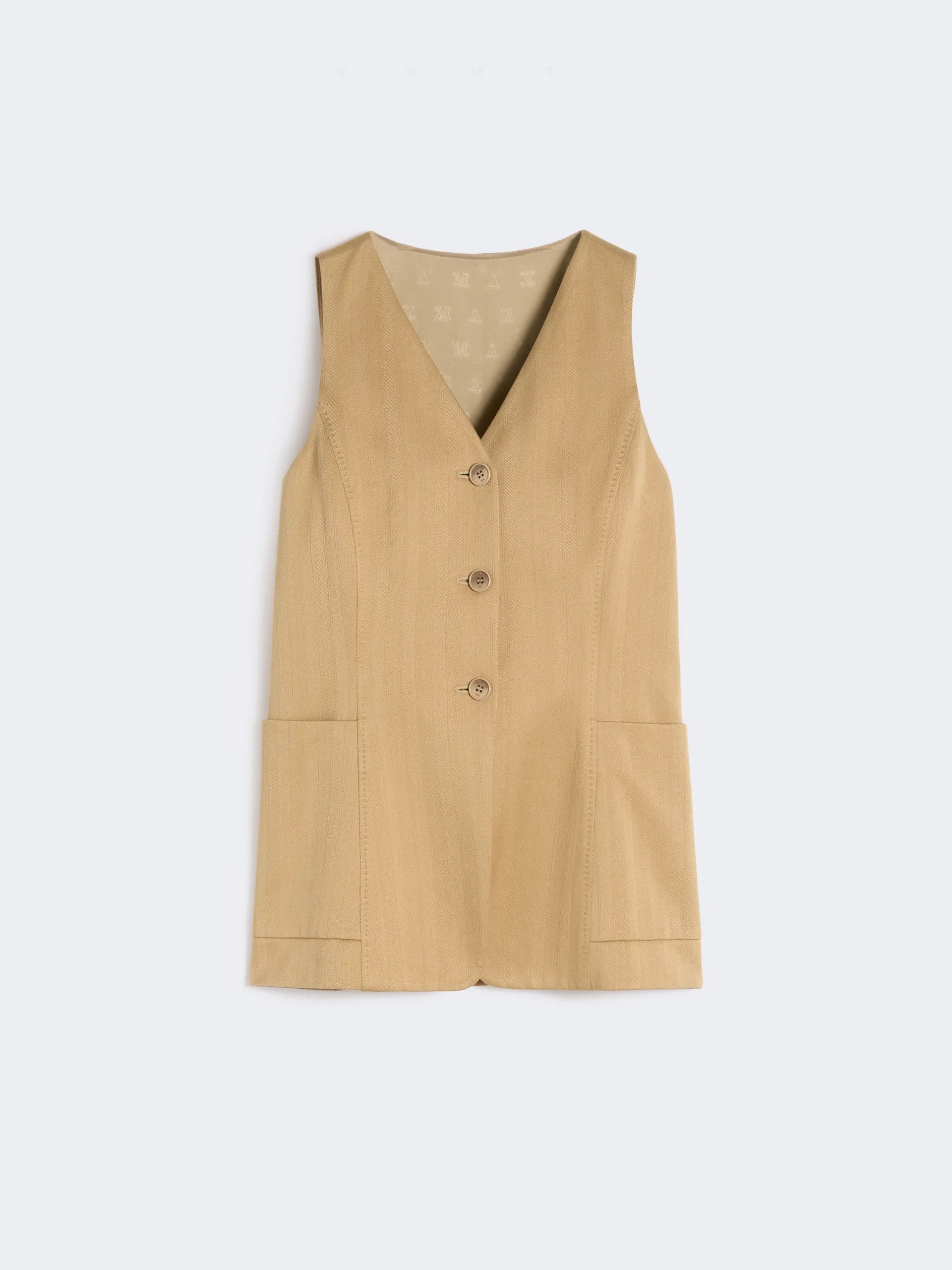 DETAILS Semi-fitted single-breasted gilet. - Gilet in pinstripe jacquard cotton jersey fabric - V-neckline - The front fastening comprises 3 branded buttons - Patch side pockets - Lined in Monogram jacquard fabric COMPOSITION AND CARE Outer fabric 100% cotton; inner fabric 100% polyester; lining 65% acetate, 35% polyester. Do not wash; do not bleach; do not tumble dry; cool iron; professionally dry clean perchloroethylene - mild process; do not wet clean.; iron with a cloth between. Distributed by Max Mara S.r.l., registered office in Reggio Emilia (Italy), Via Giulia Maramotti 4, 42124 (IT) Collection: Max Mara Product code: 1911036206004 - MXMFALLA