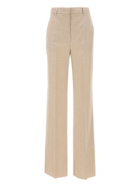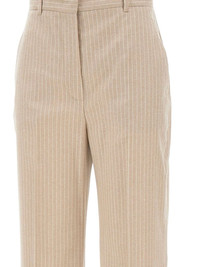 pinstripe pleated trousers Highlights - Beige - Pinstripe pattern - Side slant pockets - Pressed pleats - Concealed fly Imported Composition Wool 99%, Spandex/Elastane 1% Washing instructions Read Manufacturer Guidelines