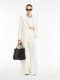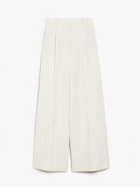 DETAILS Wide-leg trousers in linen and cotton canvas with all-over pinstriped pattern. Unlined style featuring a wide leg, front pleats and a trouser crease. Embellished with belt loops, side inset pockets and back welt pockets. Fastening with high waistband tab, zip fly and small hook. COMPOSITION AND CARE 58% flaxlinen, 42% cotton. Do not wash; do not bleach; do not tumble dry; cool iron; professionally dry clean perchloroethylene - mild process; do not wet clean.; wash the garment while it is fastened. Distributed by Max Mara S.r.l., registered office in Reggio Emilia (Italy), Via Giulia Maramotti 4, 42124 (IT)