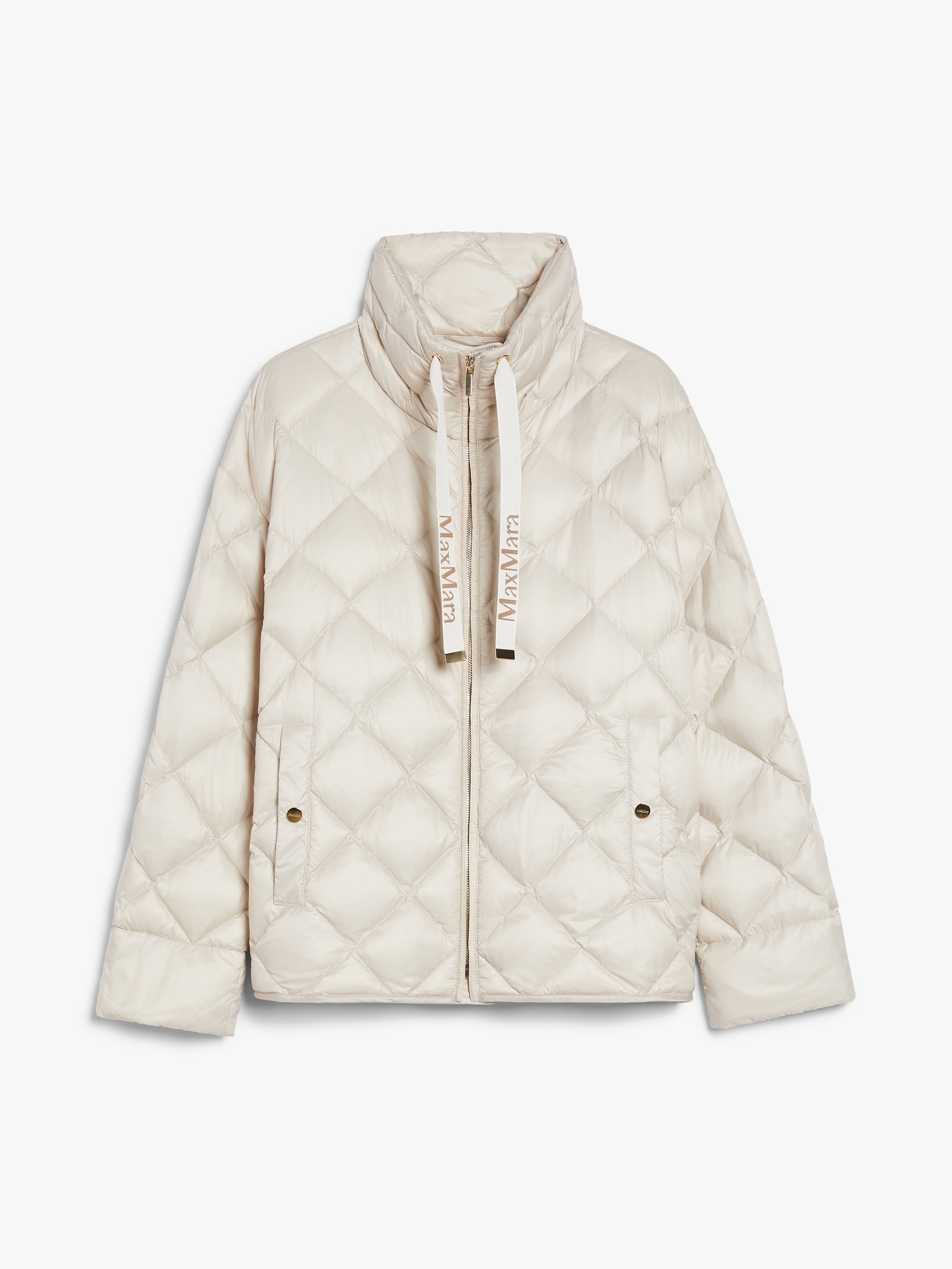DETAILS Short down jacket in water-repellent iridescent technical canvas featuring goose down padding and all-over diamond-quilted detail. The model boasts long set-in sleeves, buttoned welt pockets at the sides and a high neck, complete with branded jacquard ribbon drawstring detail. Front zip fastening. COMPOSITION AND CARE Fabric 100% polyamide; lining 100% polyamide; with quilting virgin goose-down; - exclusive of decoration. Machine wash cold delicate cycle; do not bleach; do not tumble dry; line drying in the shade; cool iron; professionally dry clean perchloroethylene - mild process.; wash the garment while it is fastened.; don’t iron the labels.; protect the ends stoppers and/or the cord ends before washing.; turn the articles inside out before washing.; contains non-textile parts of animal origin. Distributed by Max Mara S.r.l., registered office in Reggio Emilia (Italy), Via Giulia Maramotti 4, 42124 (IT)