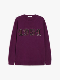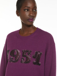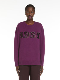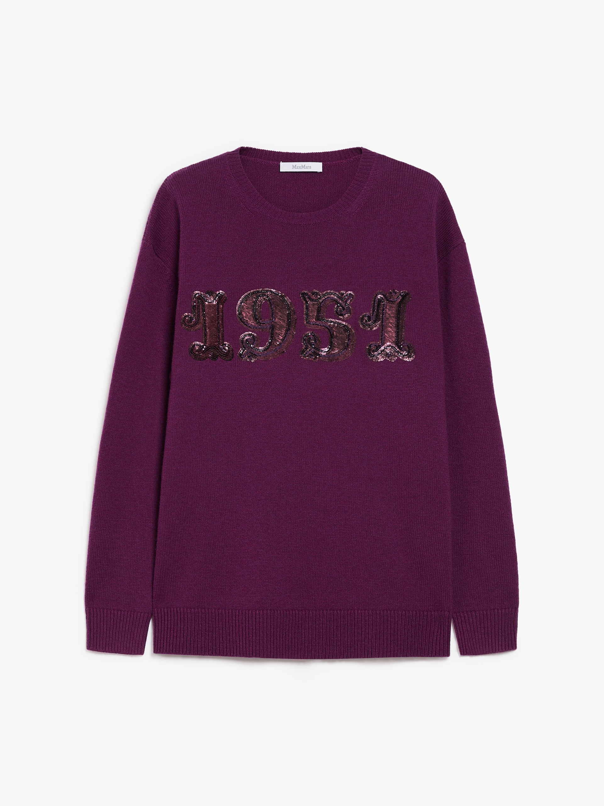 DETAILS Fine wool and cashmere crew-neck jumper adorned with a single-tone sequin embroidery featuring the 1951 motif on the front. The style features long dropped sleeves with ribbed edges. COMPOSITION AND CARE Knitted fabric 70% wool, 30% cashmere; - exclusive of decoration. Do not wash; do not bleach; do not tumble dry; cool iron; professionally dry clean perchloroethylene - mild process; do not wet clean.; iron with a cloth between.; to be ironed with no steam.; do not iron the decoration. Distributed by Max Mara S.r.l., registered office in Reggio Emilia (Italy), Via Giulia Maramotti 4, 42124 (IT)