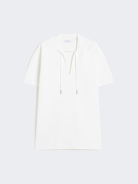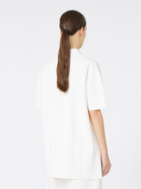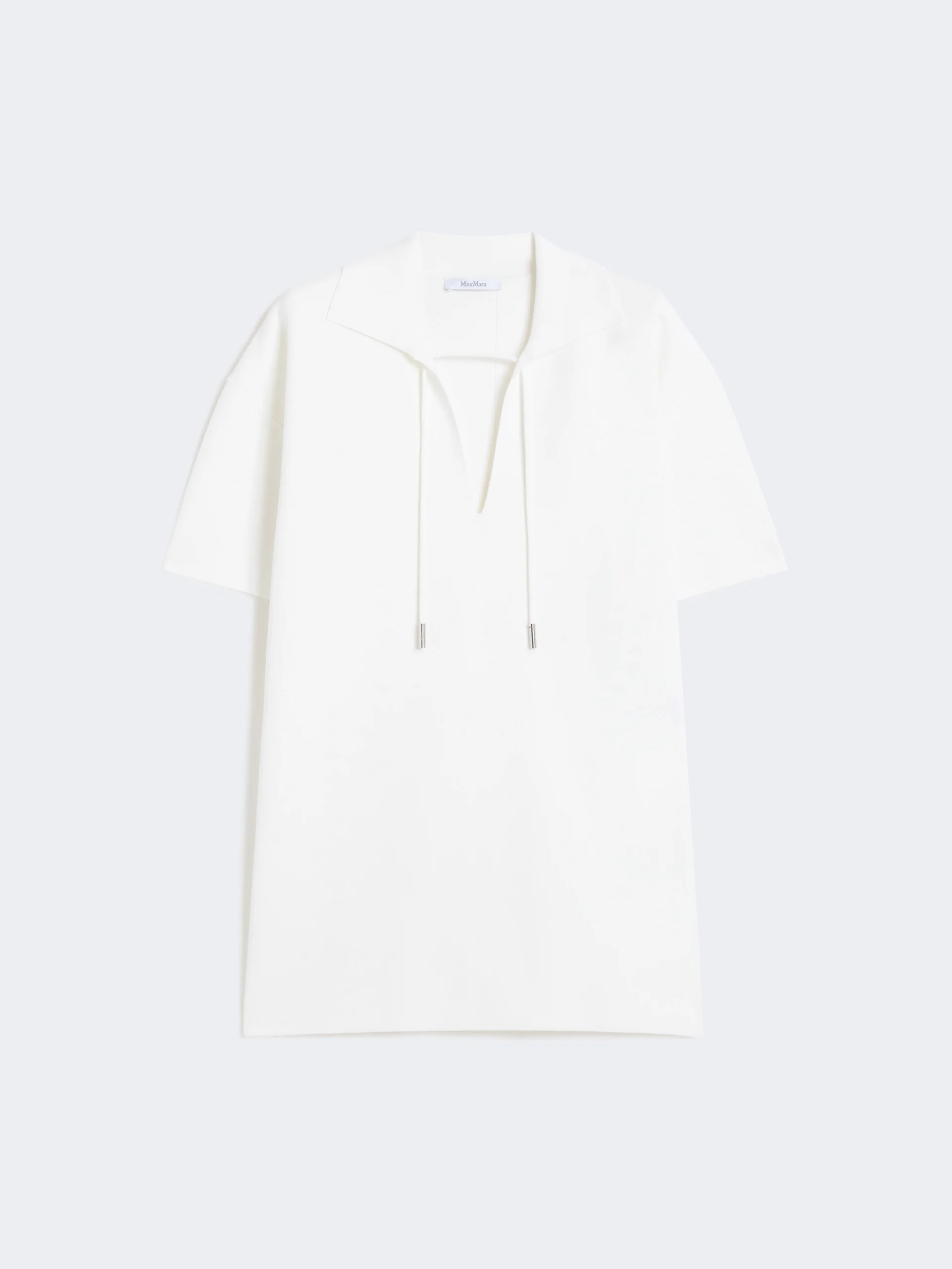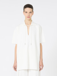 DETAILS Short-sleeved blouse featuring a plain knit on the front and a pleated-effect texture on the back. The main fabric of this garment contains raw materials derived from wood cellulose, a fibre produced with respect for the forest Viscose crepe yarn blouse Straight cut Open polo collar Open V-neck with tubular drawstring and metal ends Side slits COMPOSITION AND CARE 65% viscose, 35% polyamide. Hand wash cold (40°c max); do not bleach; do not tumble dry; flat drying in the shade; cool iron; professionally dry clean perchloroethylene - mild process; do not wet clean.; iron with a cloth between.; using neutral detergent. Distributed by Max Mara S.r.l., registered office in Reggio Emilia (Italy), Via Giulia Maramotti 4, 42124 (IT)