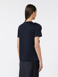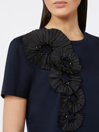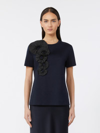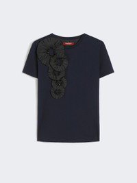DETAILS Couture T-shirt with luxurious collection embroidery on the front. Soft, mercerised pure cotton jersey T-shirt Straight cut Crew neck Short set-in sleeves Max Mara Studio logo embroidered in thread and rhinestones on the back of the neck COMPOSITION AND CARE Jersey fabric 100% cotton; fabric 100% polyester; - exclusive of decoration. Hand wash cold (40°c max); do not bleach; do not tumble dry; flat drying in the shade; cool iron; do not dry clean; do not wet clean.; iron with a cloth between.; using neutral detergent.; don’t rub.; turn the articles inside out before washing.; to be ironed on reverse.; do not iron the decoration. Distributed by Max Mara S.r.l., registered office in Reggio Emilia (Italy), Via Giulia Maramotti 4, 42124 (IT)