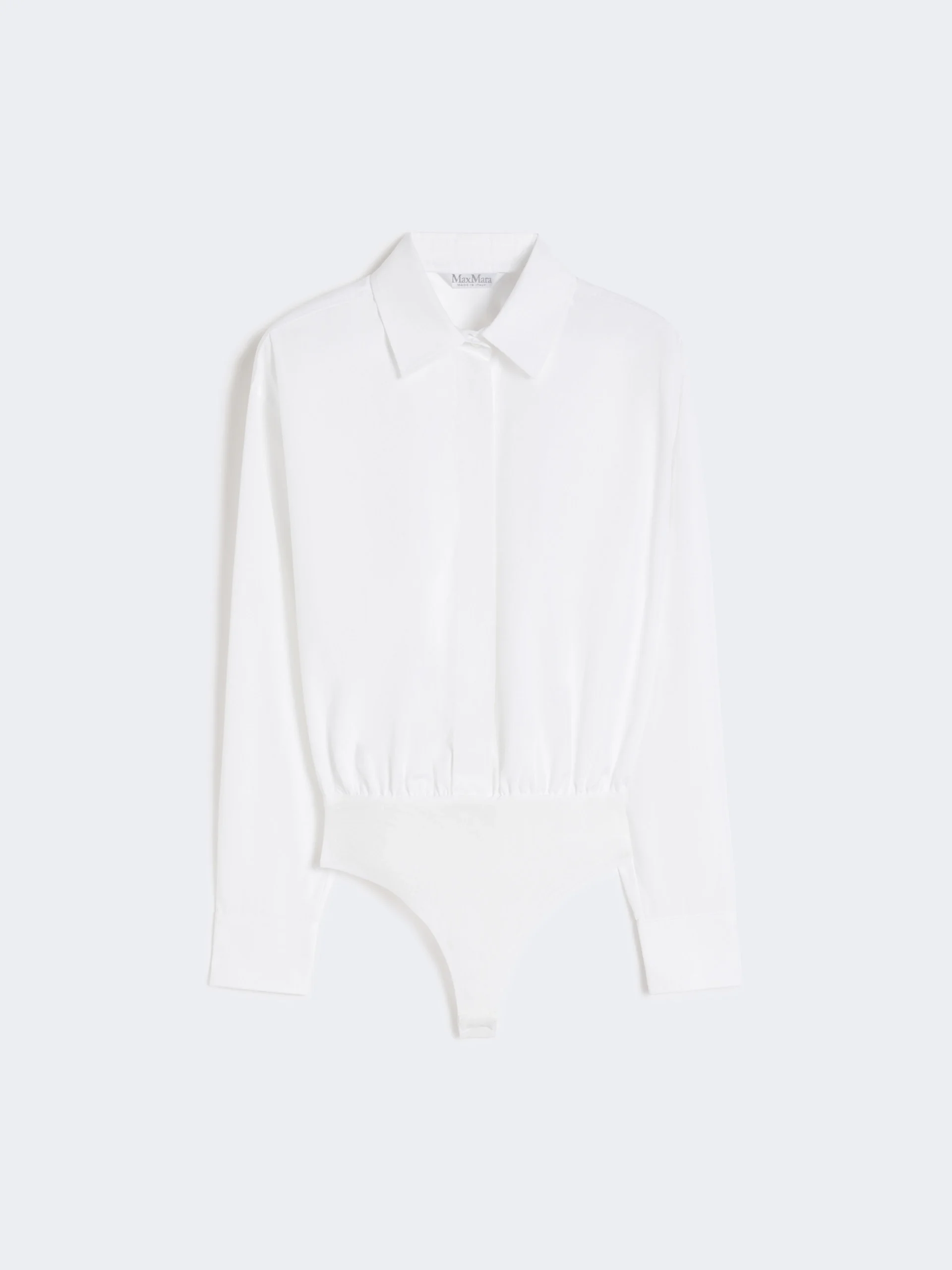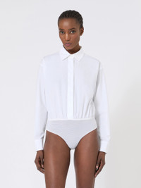 DETAILS Oversized bodysuit shirt. - Pure cotton poplin shirt - Shirt collar and double cuffs - Long set-in sleeves - Shirt cuff with metal “M” rivet - Concealed button fastening on the front - Tulle thong briefs COMPOSITION AND CARE Fabric 100% cotton; with knitted details 94% polyamide, 6% elastane. Hand wash cold (40°c max); do not bleach; do not tumble dry; line drying in the shade; cool iron; professionally dry clean perchloroethylene - mild process; do not wet clean.; put this item into a string bag before washing it.; wash the garment while it is fastened.; protect buttons before washing.; turn the articles inside out before washing.; contains non-textile parts of animal origin. Distributed by Max Mara S.r.l., registered office in Reggio Emilia (Italy), Via Giulia Maramotti 4, 42124 (IT) Collection: Max Mara Product code: 1111016106001 - MXMAERE