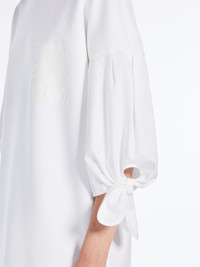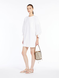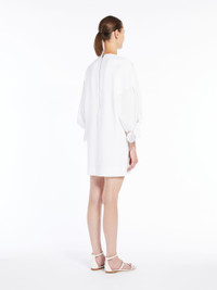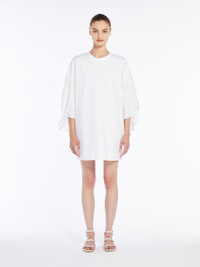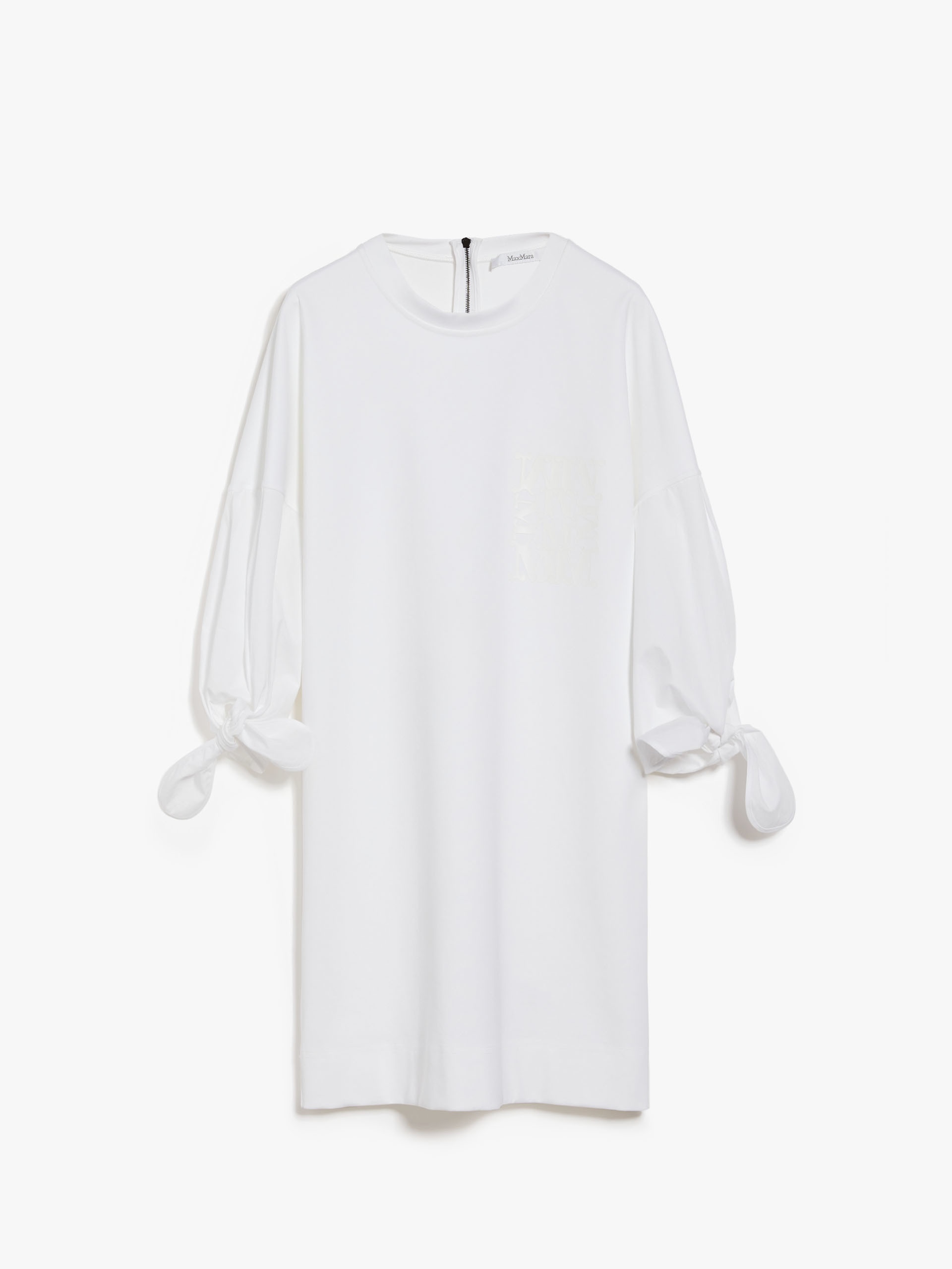 DETAILS T-shirt-style short dress featuring hem tie-adorned cotton poplin loose-fitting sleeves. Knitted neck trim. Metal zip at the back. Customised detail on the front. COMPOSITION AND CARE Jersey fabric 48% polyamide, 46% cotton, 6% elastane; sleeves 100% cotton. Hand wash cold; do not bleach; do not tumble dry; flat drying in the shade; cool iron; do not dry clean; do not wet clean.; iron with a cloth between.; using neutral detergent.; don’t rub.; turn the articles inside out before washing.; to be ironed on reverse. Distributed by Max Mara S.r.l., registered office in Reggio Emilia (Italy), Via Giulia Maramotti 4, 42124 (IT)