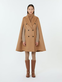 DETAILS Tailoring-inspired double-breasted midi cape. Cape in hand-sewn pure camel double-face drap Straight line with slight flare and shaped shoulderline Peak lapel collar and undercollar in matching melton Sleeve-effect seam motif on the front Button fastening Vertical welt pockets on the sides Unlined COMPOSITION AND CARE Fabric 100% camelwool; - except joining thread. Do not wash; do not bleach; do not tumble dry; cool iron; professionally dry clean perchloroethylene - mild process; do not wet clean. Distributed by Max Mara S.r.l., registered office in Reggio Emilia (Italy), Via Giulia Maramotti 4, 42124 (IT)