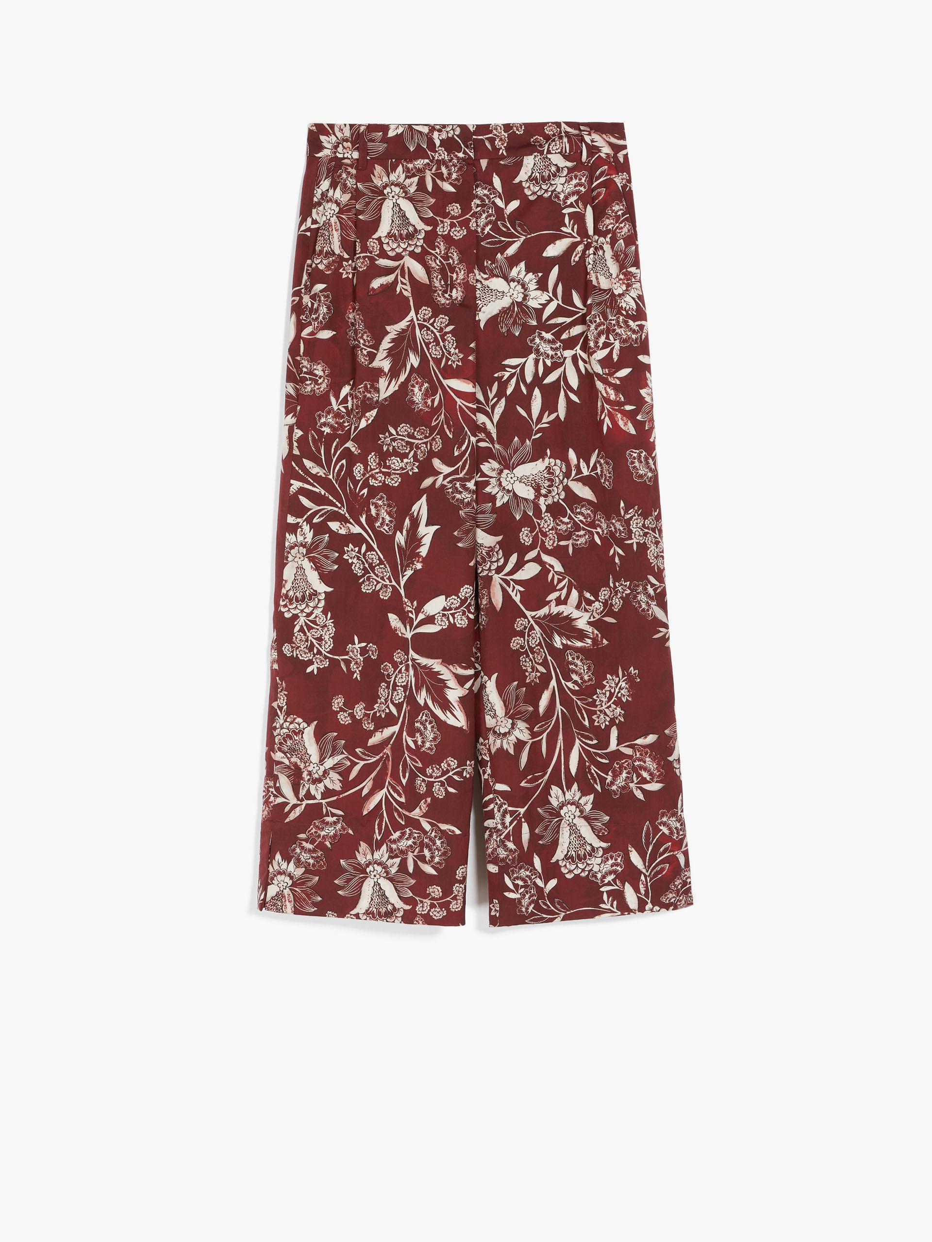 DETAILS Printed cotton poplin trousers featuring slant side pockets and small side slit-embellished leg hems. Fly-covered zip and a small hook-and-bar fastening. COMPOSITION AND CARE 100% cotton. Machine wash cold delicate cycle; do not bleach; do not tumble dry; line drying in the shade; cool iron; professionally dry clean perchloroethylene - mild process.; wash the garment while it is fastened.; do not iron the buttons.; contains non-textile parts of animal origin. Distributed by Max Mara S.r.l., registered office in Reggio Emilia (Italy), Via Giulia Maramotti 4, 42124 (IT)