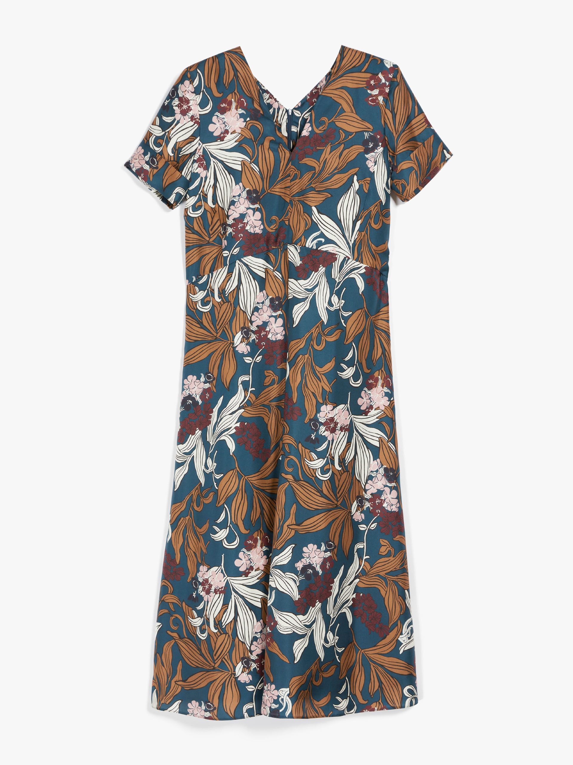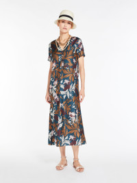 DETAILS Pure silk twill dress featuring a Tahiti flower and leaf print. The feminine, flared model boasts a V-neck front and back. The contoured waist darts define the figure, whilst the short sleeves are completed by turned-up hem detail. COMPOSITION AND CARE Fabric 100% silk; lining 100% silk. Do not wash; do not bleach; do not tumble dry; cool iron; professionally dry clean perchloroethylene - mild process; do not wet clean. Distributed by Max Mara S.r.l., registered office in Reggio Emilia (Italy), Via Giulia Maramotti 4, 42124 (IT)