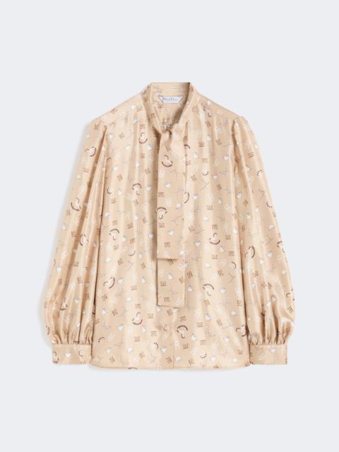 DETAILS Mannish-style shirt featuring tie-up sash detail at the neck. - Printed pure silk twill shirt - Fitted waist - Slight puff-style sleeves with double cuff detail - Visible button fastening on the front - Gathered yoke at the back - Rounded hem with side slits COMPOSITION AND CARE 100% silk. Do not wash; do not bleach; do not tumble dry; cool iron; professionally dry clean perchloroethylene - mild process; do not wet clean.; wash the garment while it is fastened.; do not iron the buttons.; protect buttons before washing.; turn the articles inside out before washing. Distributed by Max Mara S.r.l., registered office in Reggio Emilia (Italy), Via Giulia Maramotti 4, 42124 (IT) Collection: Max Mara Product code: 1111086106002 - MXMZUCCA