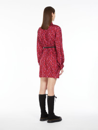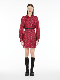 DETAILS Short shirt dress in exquisite, printed pure silk twill, featuring a straight silhouette with shirt collar and long, low-set sleeves. Style dedicated to the Chinese New Year, embellished with a small dragon in lurex thread embroidered on the left-hand side cuff. The contrasting black leather belt allows you to accentuate the waist. Concealed button fastening at the front COMPOSITION AND CARE Dress fabric 100% silk; with belt in cattle. Dress: do not wash; do not bleach; do not tumble dry; cool iron; professionally dry clean perchloroethylene - mild process; do not wet clean.; Wash the garment while it is fastened.; Turn the articles inside out before washing. Belt: do not wash; do not bleach; do not tumble dry; do not iron; do not dry clean; do not wet clean. Distributed by Max Mara S.r.l., registered office in Reggio Emilia (Italy), Via Giulia Maramotti 4, 42124 (IT)