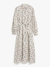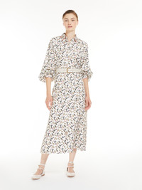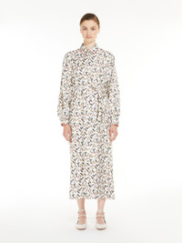 DETAILS Long shirt dress in exquisite pure silk twill with all-over print, featuring a feminine silhouette with a flared skirt, wide raglan sleeves with cuffs, and a shirt collar. Unlined model, finished with piping details and matching belt to tie at the waist. Concealed front fastening. Length: 125 cm. COMPOSITION AND CARE Fabric 100% silk; - exclusive of decoration. Do not wash; do not bleach; do not tumble dry; cool iron; professionally dry clean perchloroethylene - mild process; do not wet clean.; wash the garment while it is fastened.; do not iron the buttons.; protect buttons before washing.; turn the articles inside out before washing. Distributed by Max Mara S.r.l., registered office in Reggio Emilia (Italy), Via Giulia Maramotti 4, 42124 (IT)