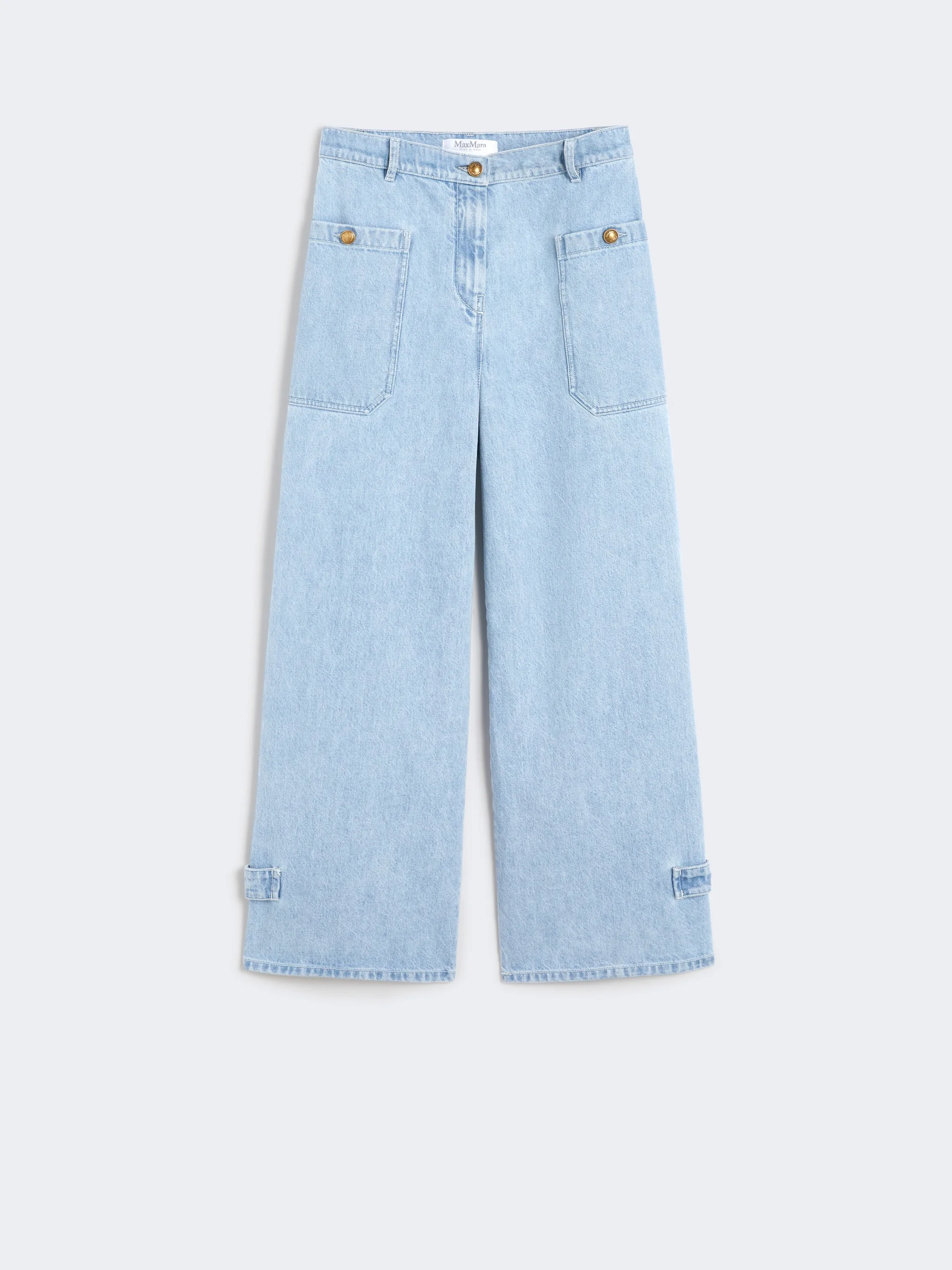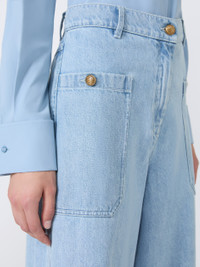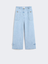 DETAILS Menswear-inspired jeans. Loose fit, adjustable with ankle cuff straps. The main fabric contains at least 50% cotton fibre, grown according to organic farming standards Garment-treated indigo denim trousers Logo button and zip fastening Patch pockets with buttons on the sides Belt loops, peplum on the waist back Customised label on the waist back COMPOSITION AND CARE 100% cotton. Machine wash cold delicate cycle; do not bleach; do not tumble dry; line drying in the shade; cool iron; do not dry clean.; wash the garment while it is fastened.; don’t iron the labels.; protect buttons before washing.; turn the articles inside out before washing.; take care when wearing light-coloured clothes or accessories because, with the heat of the body, the indigo fabric , may fade and stain. be careful while sitting on light coloured surfaces, especially if wet. wash garments separately and always turned inside out. hang the garment turned inside out by avoiding to expose it to direct sunlight. avoid removing isolated stains.; contains non-textile parts of animal origin. Distributed by Max Mara S.r.l., registered office in Reggio Emilia (Italy), Via Giulia Maramotti 4, 42124 (IT)