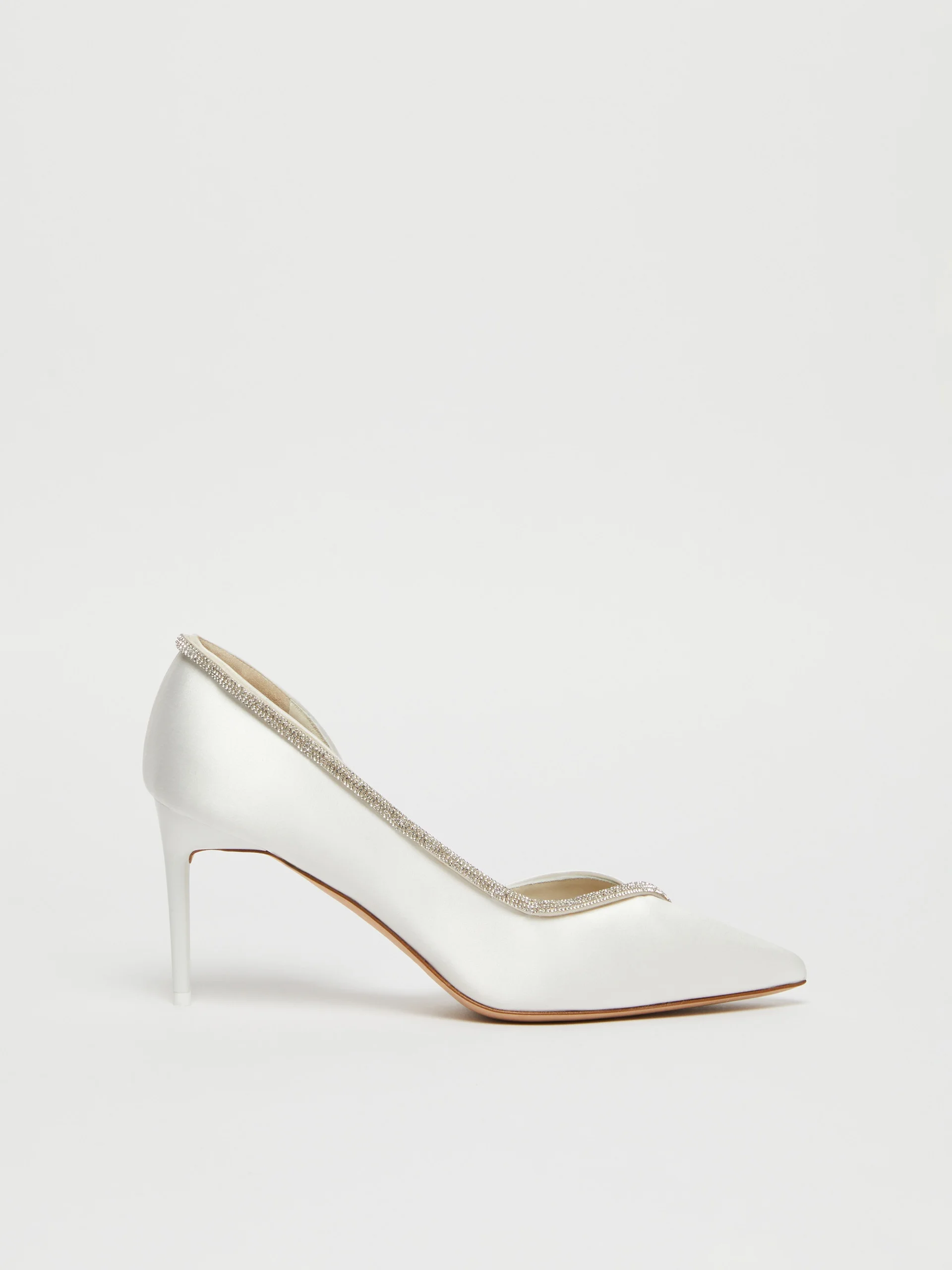 DETAILS D'Orsay court shoes with tapered tip embellished with a micro glass crystal trim along the entire edge. Court shoes in viscose and silk bonded satin Nappa-leather lining Leather sole with non-slip MaxMaraGram motif 8-cm cigarette heel in shiny matching lacquer COMPOSITION AND CARE Upper in 72% viscose, 28% silk; with details in polyester, glass; lining in lamb leather; sole in leather. Distributed by Max Mara S.r.l., registered office in Reggio Emilia (Italy), Via Giulia Maramotti 4, 42124 (IT)