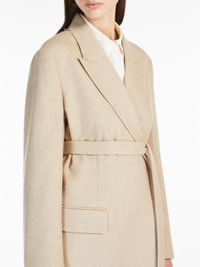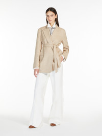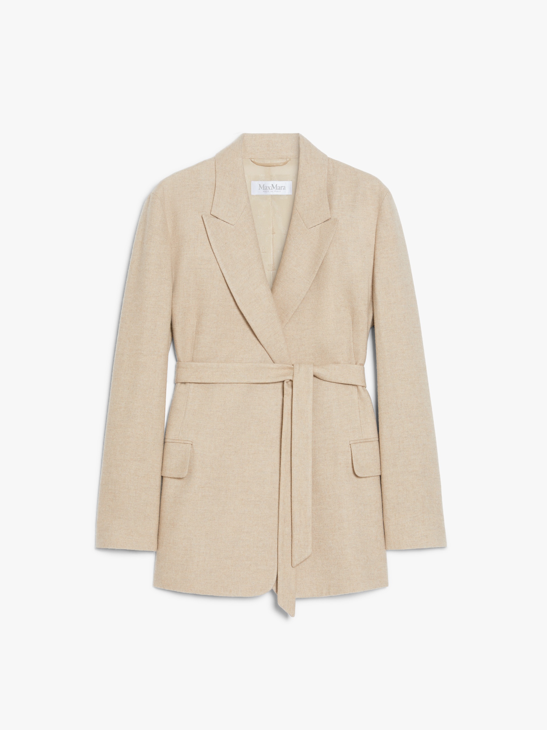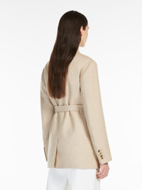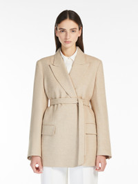 DETAILS Relaxed-fit unstructured jacket made from luxurious melange wool, silk and cashmere batavia. The construction features a peak lapel collar, double-welt pockets with applied flap on the front and long set-in sleeves with four buttons on the cuffs. Lined in stretch Monogram fabric and finished with central vent on the back. Slip-on styling with a matching belt at the waist that accentuates the silhouette. COMPOSITION AND CARE Fabric 55% virgin wool, 30% silk, 15% cashmere; lining 65% acetate, 35% polyester. Do not wash; do not bleach; do not tumble dry; cool iron; professionally dry clean perchloroethylene - mild process; do not wet clean.; do not iron the buttons.; protect buttons before washing.; contains non-textile parts of animal origin. Distributed by Max Mara S.r.l., registered office in Reggio Emilia (Italy), Via Giulia Maramotti 4, 42124 (IT)