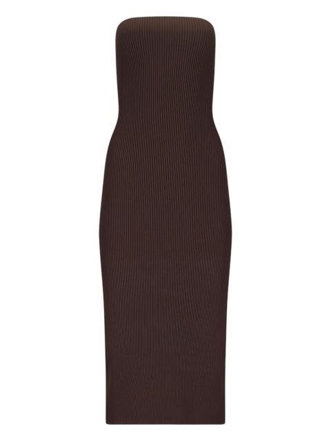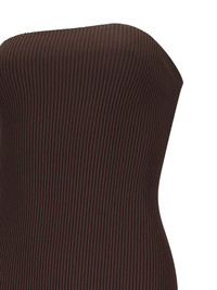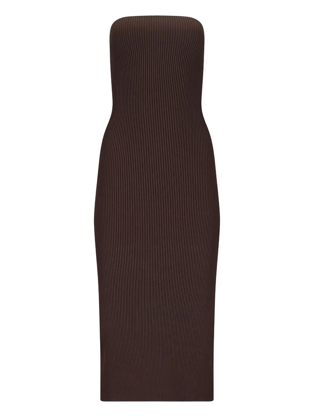 ribbed strapless midi dress Highlights - Dark brown - Ribbed texture - Strapless neckline - Straight hem Imported Composition Viscose 70%, Polyester 20%, Polyamide 10% Washing instructions Read Manufacturer Guidelines