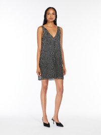 DETAILS Short sleeveless dress, made of organza and entirely covered in all-over embroidered sequins with a flower motif. Straight-cut style with a V neck at the front and bare back framed by a deep round neckline at the back. Matching slip in light cady. COMPOSITION AND CARE Dress fabric 100% silk; joining thread 100% polyester; - exclusive of decoration. Petticoat 64% triacetate, 36% polyester. Dress: do not wash; do not bleach; do not tumble dry; cool iron; professionally dry clean perchloroethylene - mild process; do not wet clean.; Put this item into a string bag before washing it. Petticoat: machine wash cold delicate cycle; do not bleach; do not tumble dry; line drying in the shade; cool iron; professionally dry clean perchloroethylene - normal process.; Iron with a cloth between. Distributed by Max Mara S.r.l., registered office in Reggio Emilia (Italy), Via Giulia Maramotti 4, 42124 (IT)
