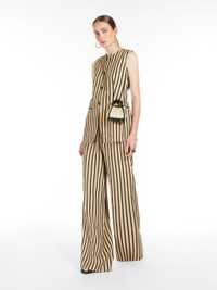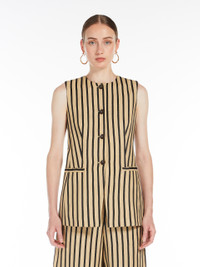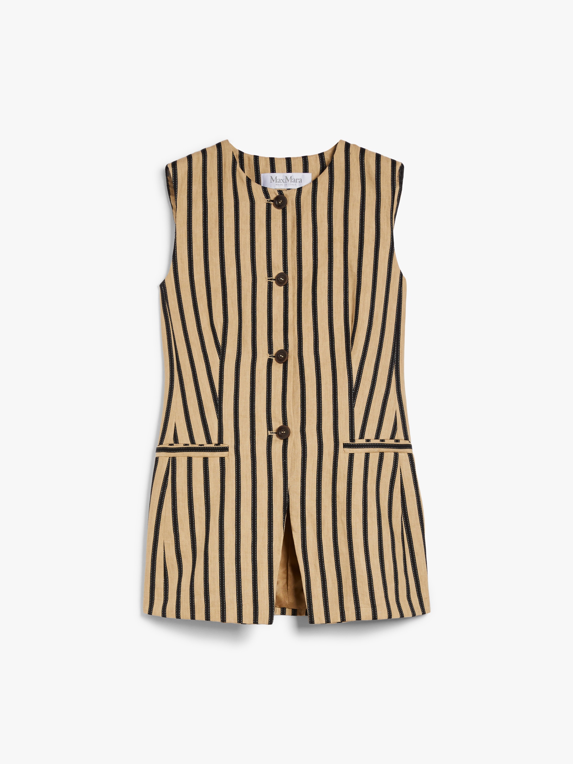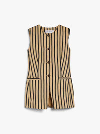 DETAILS Crew-neck waistcoat in linen and cotton fabric with vertical stripes. Lined, fitted style with sewn pleats at the waist and horizontal welt pockets on the front. The matching belt allows you to accentuate the waist. Single-breasted closure with visible leather buttons. COMPOSITION AND CARE Fabric 71% flaxlinen, 25% cotton, 4% viscose; lining 56% viscose, 44% cotton. Do not wash; do not bleach; do not tumble dry; cool iron; professionally dry clean perchloroethylene - mild process; do not wet clean.; wash the garment while it is fastened.; do not iron the buttons.; protect buttons before washing.; turn the articles inside out before washing.; contains non-textile parts of animal origin. Distributed by Max Mara S.r.l., registered office in Reggio Emilia (Italy), Via Giulia Maramotti 4, 42124 (IT)