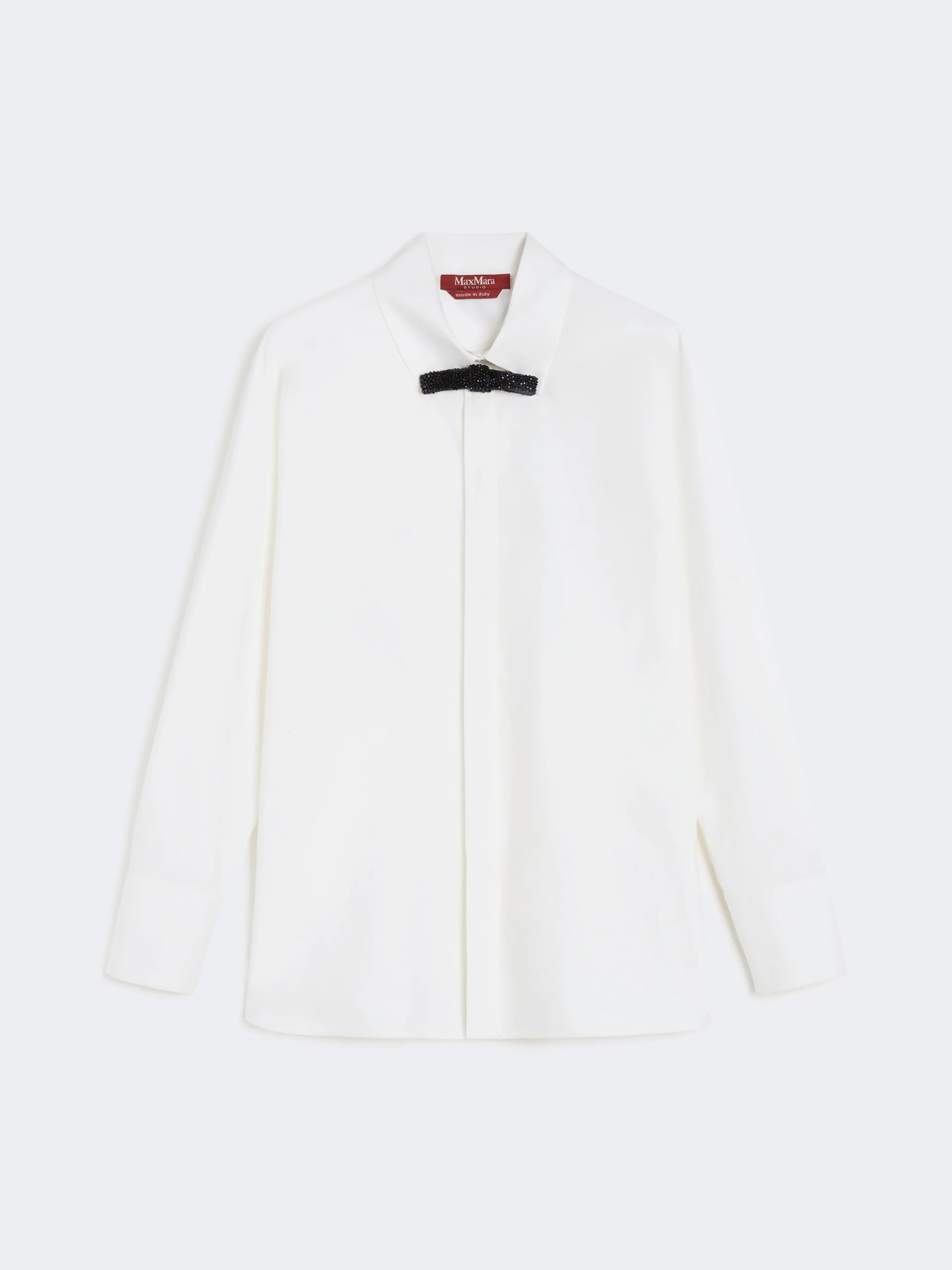DETAILS Menswear-inspired shirt with removable bow tie and contrasting faceted jet embroidery. - Silk and cotton poplin shirt - Straight cut - Shirt collar - Kimono sleeves with cuff and jewel buttons - Concealed front fastening - Rounded hem with side slits COMPOSITION AND CARE Fabric 86% cotton, 14% silk; - exclusive of decoration. Do not wash; do not bleach; do not tumble dry; cool iron; professionally dry clean perchloroethylene - mild process; do not wet clean.; wash the garment while it is fastened.; do not iron the buttons.; remove the decorations before washing.; contains non-textile parts of animal origin. Distributed by Max Mara S.r.l., registered office in Reggio Emilia (Italy), Via Giulia Maramotti 4, 42124 (IT)