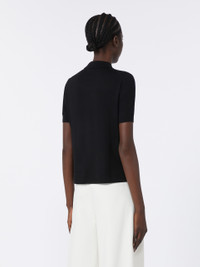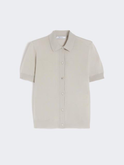 DETAILS Short-sleeved cardigan with a slim fit. Fine, pure wool yarn cardigan Straight cut Shirt collar Front fastening with knitted-cover buttons Small, squared side slits COMPOSITION AND CARE 100% virgin wool. Hand wash cold (40°c max); do not bleach; do not tumble dry; flat drying in the shade; cool iron; professionally dry clean perchloroethylene - mild process; do not wet clean.; iron with a cloth between.; using neutral detergent.; protect accessories before washing. Distributed by Max Mara S.r.l., registered office in Reggio Emilia (Italy), Via Giulia Maramotti 4, 42124 (IT)
