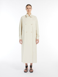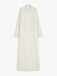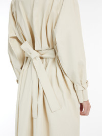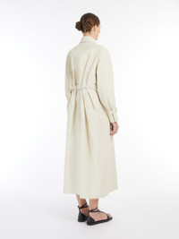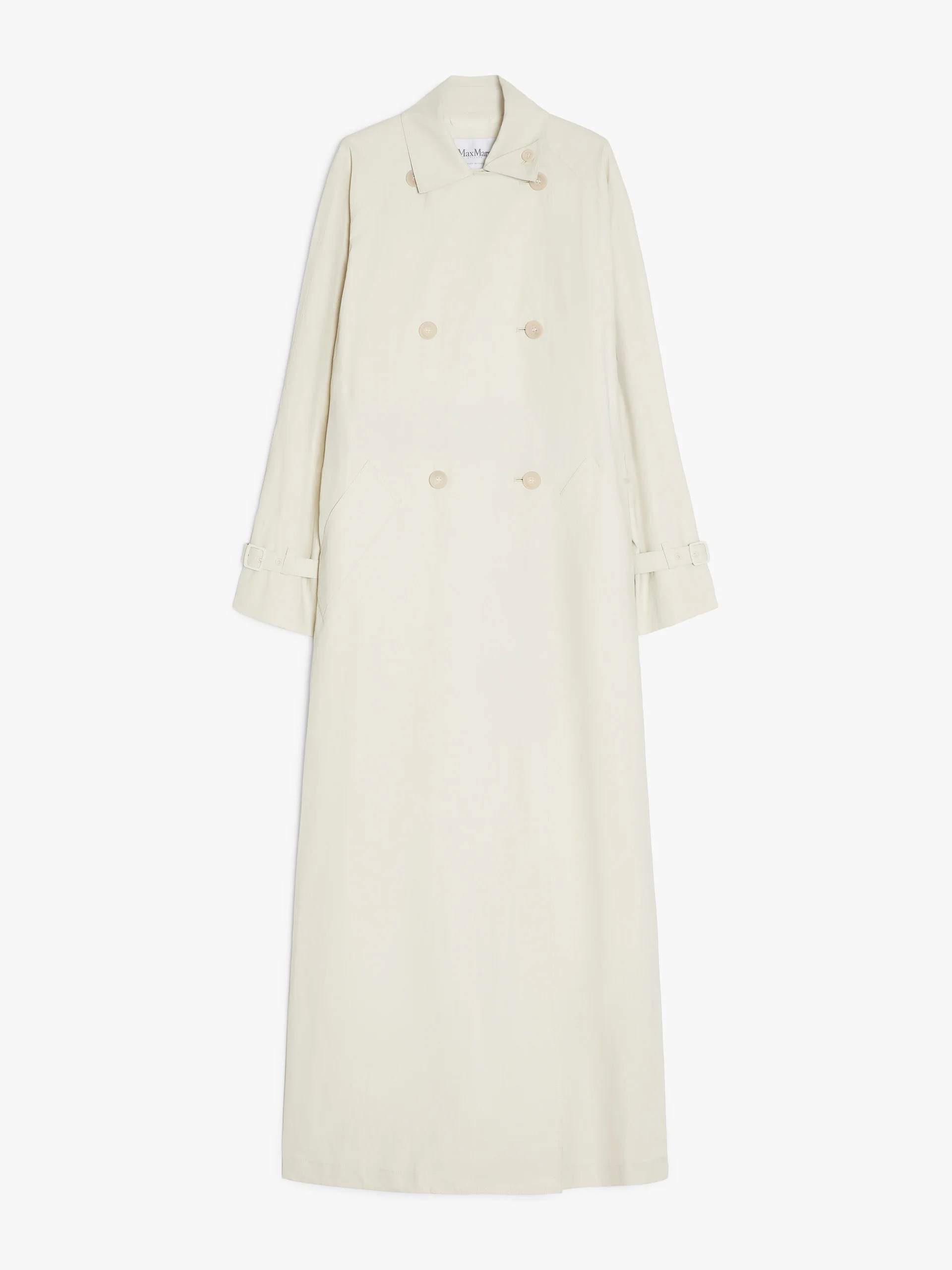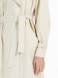 DETAILS Long double-breasted trench coat made of pure linen cloth with a coated finish on the outside. Lined garment featuring a straight silhouette with a stitched pleated pattern at the back waist and a dual-use lapel collar, folded down and fastened with a decorative button on the left side. Completed by long raglan sleeves with cuff straps, welt pockets at the sides and a matching belt with buckle to accentuate the waist. Visible button fastening. COMPOSITION AND CARE Fabric 100% flaxlinen; - exclusive of coating; lining 100% cotton. Hand wash cold; do not bleach; do not tumble dry; line drying in the shade; cool iron; professionally dry clean perchloroethylene - mild process; do not wet clean.; do not iron the buttons.; protect buttons before washing.; remove the buckle before washing.; iron with a cloth between.; contains non-textile parts of animal origin. Distributed by Max Mara S.r.l., registered office in Reggio Emilia (Italy), Via Giulia Maramotti 4, 42124 (IT)