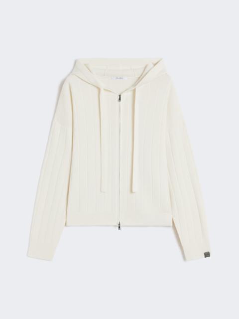 DETAILS Cardigan with drawstring hood and slightly cropped waist in an all-over wide-rib knit. Pure cashmere yarn cardigan Comfortable fit and straight lines Long sleeves with dropped shoulders Front fastening with double slider zip Leather logo label on the left cuff Ribbed trim COMPOSITION AND CARE 100% cashmere. Hand wash cold (40°c max); do not bleach; do not tumble dry; flat drying in the shade; cool iron; professionally dry clean perchloroethylene - mild process; do not wet clean.; iron with a cloth between.; using neutral detergent. Distributed by Max Mara S.r.l., registered office in Reggio Emilia (Italy), Via Giulia Maramotti 4, 42124 (IT)