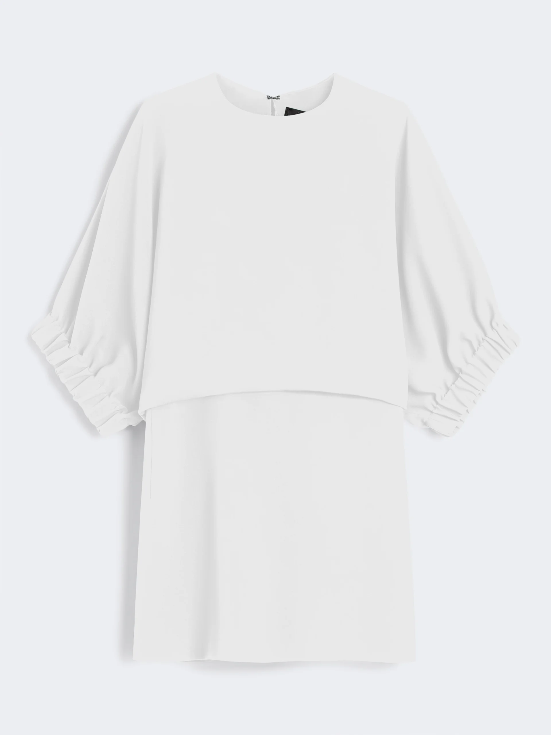 DETAILS Short dress with a deep slit on the back that adds volume to the bodice and sleeves. Cady dress Loose bodice and pencil skirt Crew neckline and fitted waist Wide short sleeves with gathered elastic cuff Grosgrain laces to tie at the back Concealed zip fastening on the back Semi-lined in pure silk satin COMPOSITION AND CARE Fabric 65% triacetate, 35% polyester; upper lining 100% silk; bottom part lining 95% acetate, 5% elastane; decorations in 50% viscose, 50% cotton. Do not wash; do not bleach; do not tumble dry; cool iron; professionally dry clean perchloroethylene - mild process; do not wet clean.; iron with a cloth between. Distributed by Max Mara S.r.l., registered office in Reggio Emilia (Italy), Via Giulia Maramotti 4, 42124 (IT)