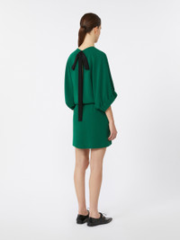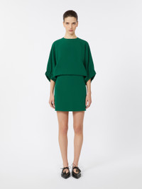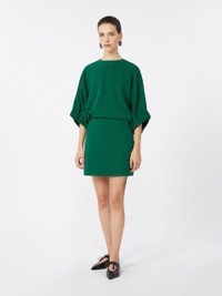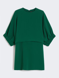DETAILS Short dress with a deep slit on the back that adds volume to the bodice and sleeves. Cady dress Loose bodice and pencil skirt Crew neckline and fitted waist Wide short sleeves with gathered elastic cuff Grosgrain laces to tie at the back Concealed zip fastening on the back Semi-lined in pure silk satin COMPOSITION AND CARE Fabric 65% triacetate, 35% polyester; upper lining 100% silk; bottom part lining 95% acetate, 5% elastane; decorations in 50% viscose, 50% cotton. Do not wash; do not bleach; do not tumble dry; cool iron; professionally dry clean perchloroethylene - mild process; do not wet clean.; iron with a cloth between. Distributed by Max Mara S.r.l., registered office in Reggio Emilia (Italy), Via Giulia Maramotti 4, 42124 (IT)