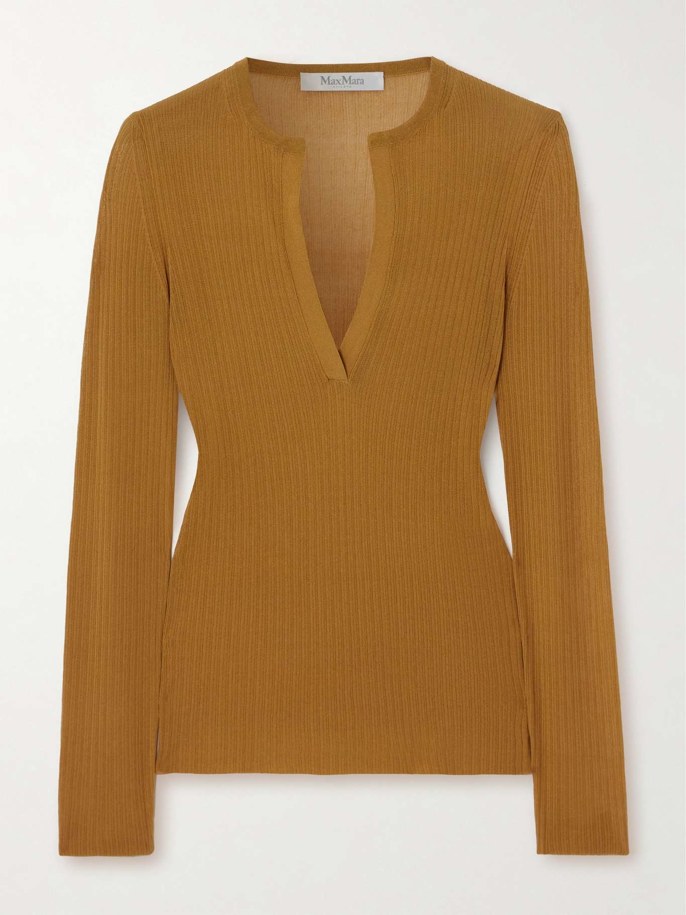 EDITORS'NOTES Max Mara's sweater is rib-knitted from fine silk and closely hugs your figure. It has a deep, notched V-neckline and comes in a beautiful mustard shade that works especially well with navy. SIZE & FIT Model measurements: - Fits true to size, take your normal size - Cut for a slim fit - Lightweight knit - Model is 180cm/ 5'11" and is wearing a size Small - Bust: 81cm/ 32" - Waist: 63cm/ 25" - Hip: 91cm/ 36" DETAILS & CARE - Mustard silk - Slips on - 100% silk - Hand wash