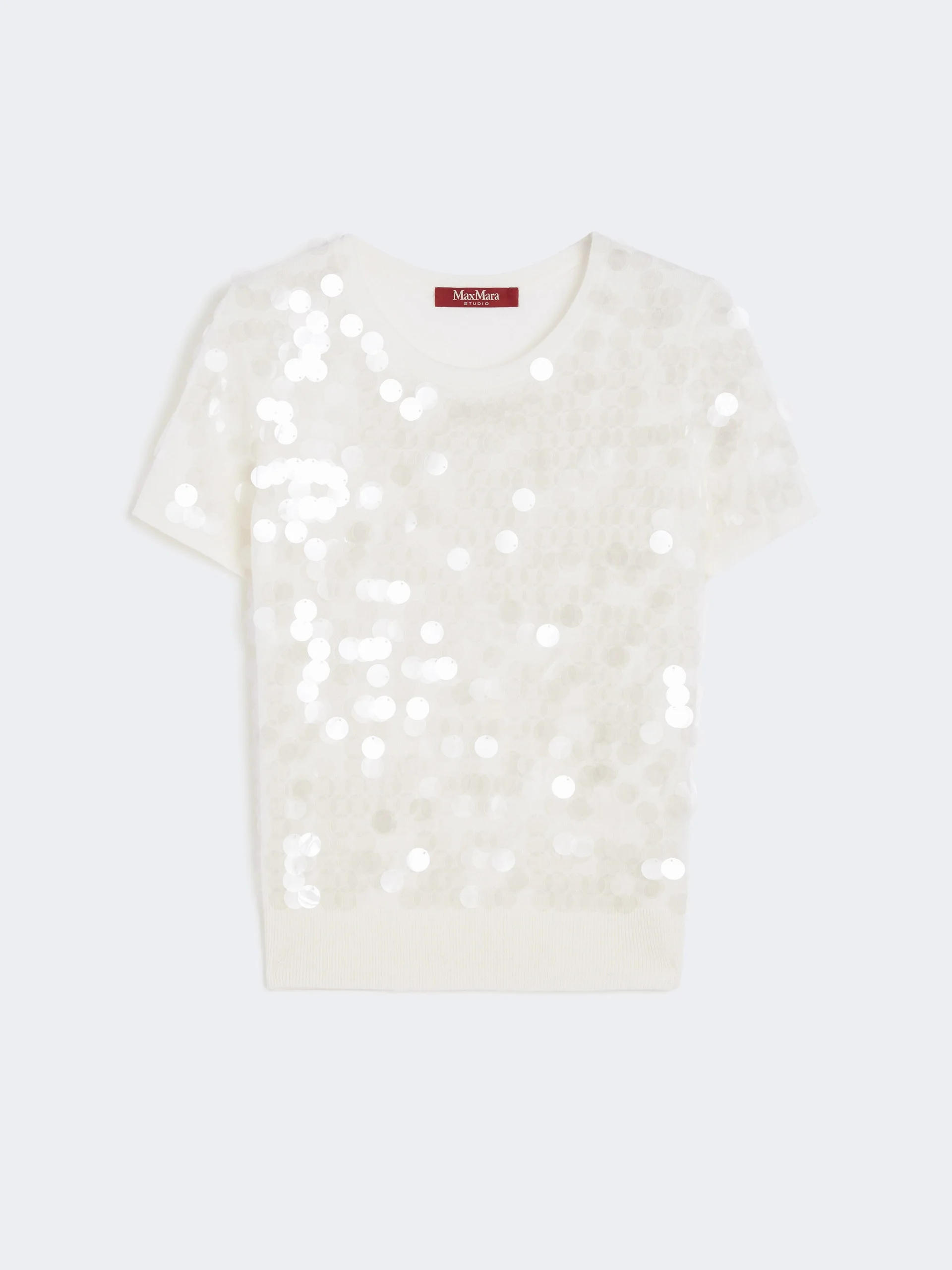 DETAILS Jumper embellished with an all-over embroidery of transparent sequins. Pure wool yarn jumper Loose fit Crew neck Short set-in sleeves Wide, ribbed trim at the hem COMPOSITION AND CARE Knitted fabric 100% virgin wool; - exclusive of decoration. Do not wash; do not bleach; do not tumble dry; cool iron; professionally dry clean perchloroethylene - mild process; do not wet clean.; don’t rub.; squeeze without wringing.; to be ironed on reverse. Distributed by Max Mara S.r.l., registered office in Reggio Emilia (Italy), Via Giulia Maramotti 4, 42124 (IT)